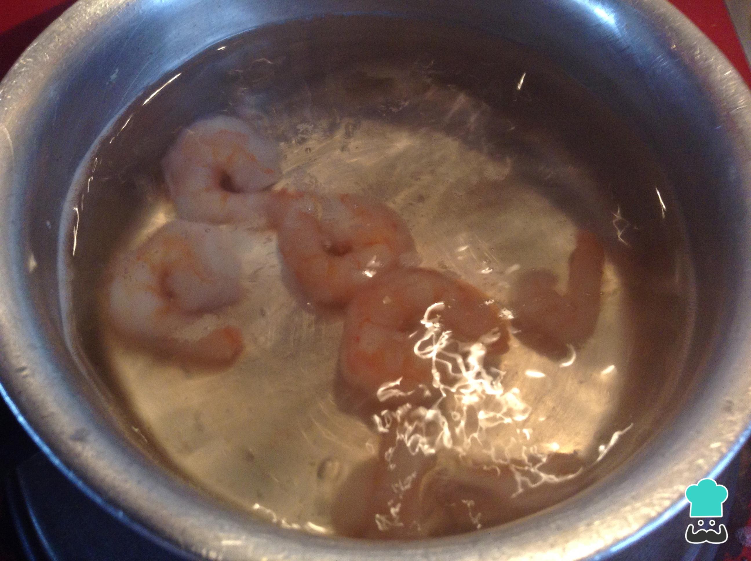Mientras reservas el pescado en la nevera, lleva una olla a fuego medio con agua. Una vez esté a punto de ebullición añade los camarones y deja blanquear durante un minutos, retíralos y corta la cocción con agua fría para que no se sobrecocine. Como estamos realizando un ceviche con camarones es mejor realizar esta cocción en los mariscos.