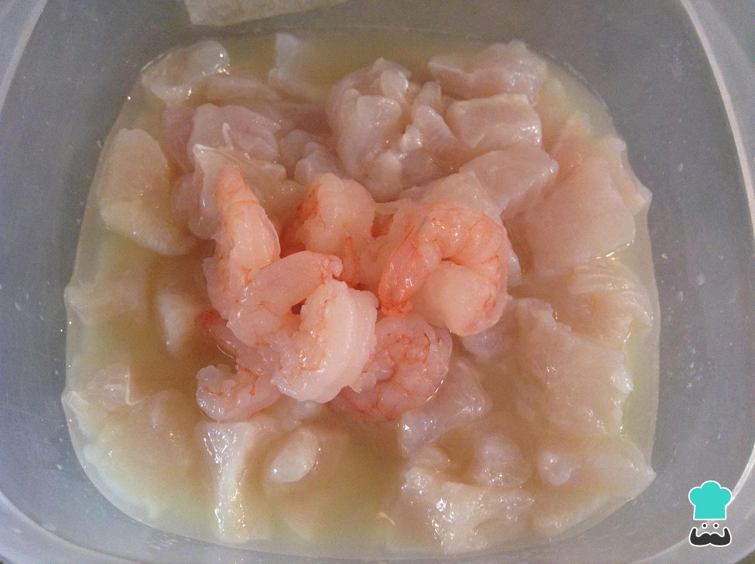 Añade los camarones al bol donde tenemos el pescado fresco y añade el zumo de los limones, marina bien las proteínas del ceviche mixto en el refrigerador o nevera durante 20 minutos aproximadamente.