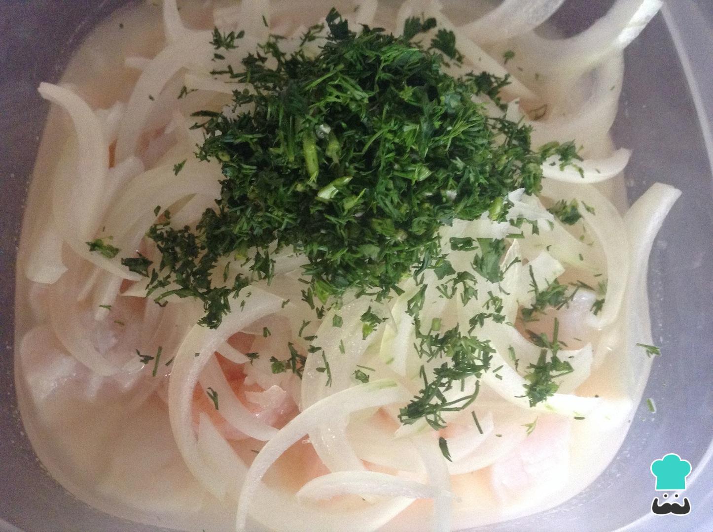Pica la cebolla en plumas o cuadros (como desees), generalmente se sirve en plumas, y añade al bol donde estamos preparando el ceviche mixto marinado con el cilantro fresco también finamente picado. Mezcla muy bien todos los ingredientes hasta que se integren.