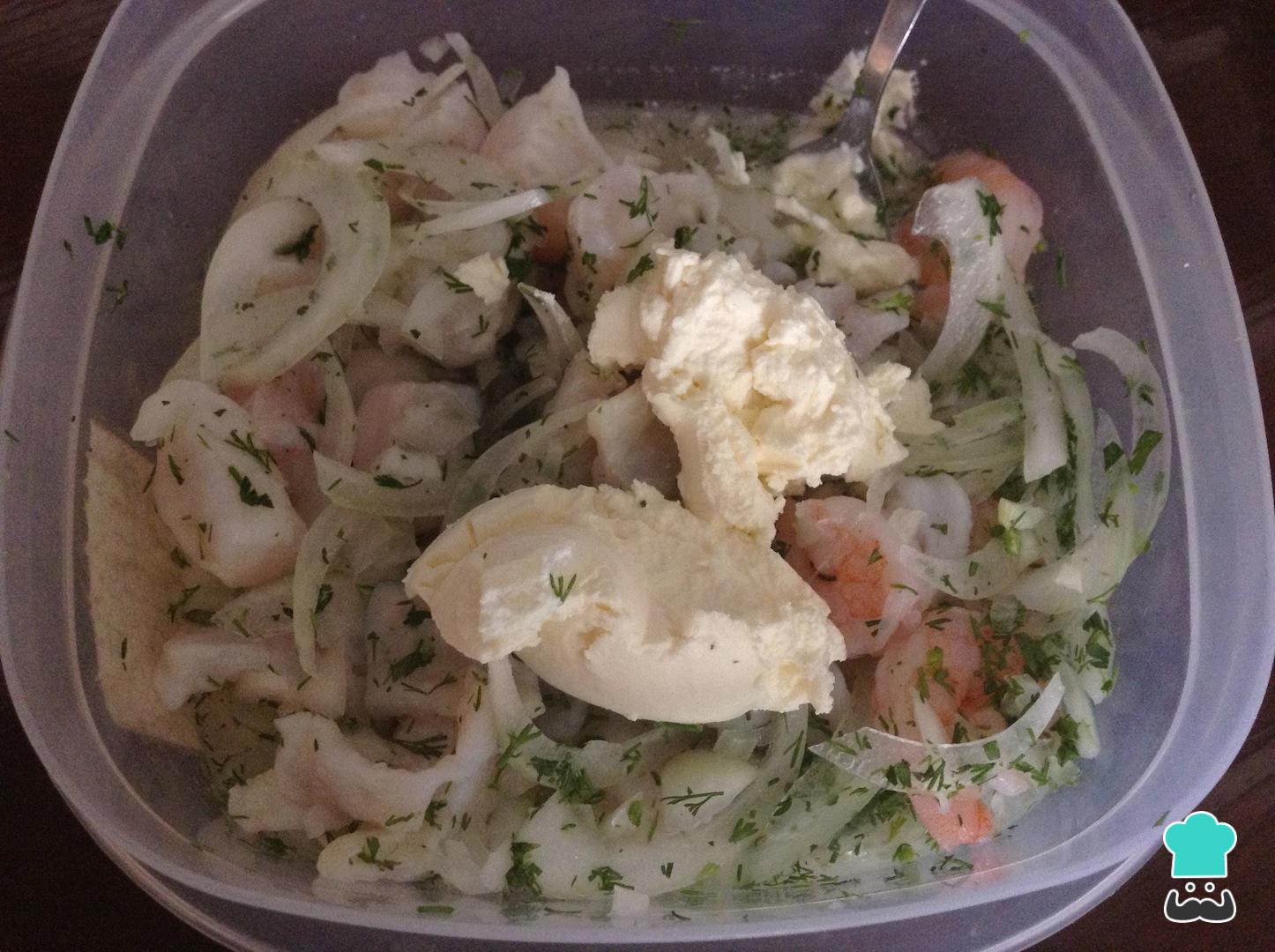 Por último, añade el queso crema o sour cream al ceviche, la idea de esta preparación es que tenga un toque ácido y cremoso a la vez, lo cual lo convertirá en una preparación realmente única. Mezcla muy bien hasta integrar los ingredientes de nuestro ceviche.
