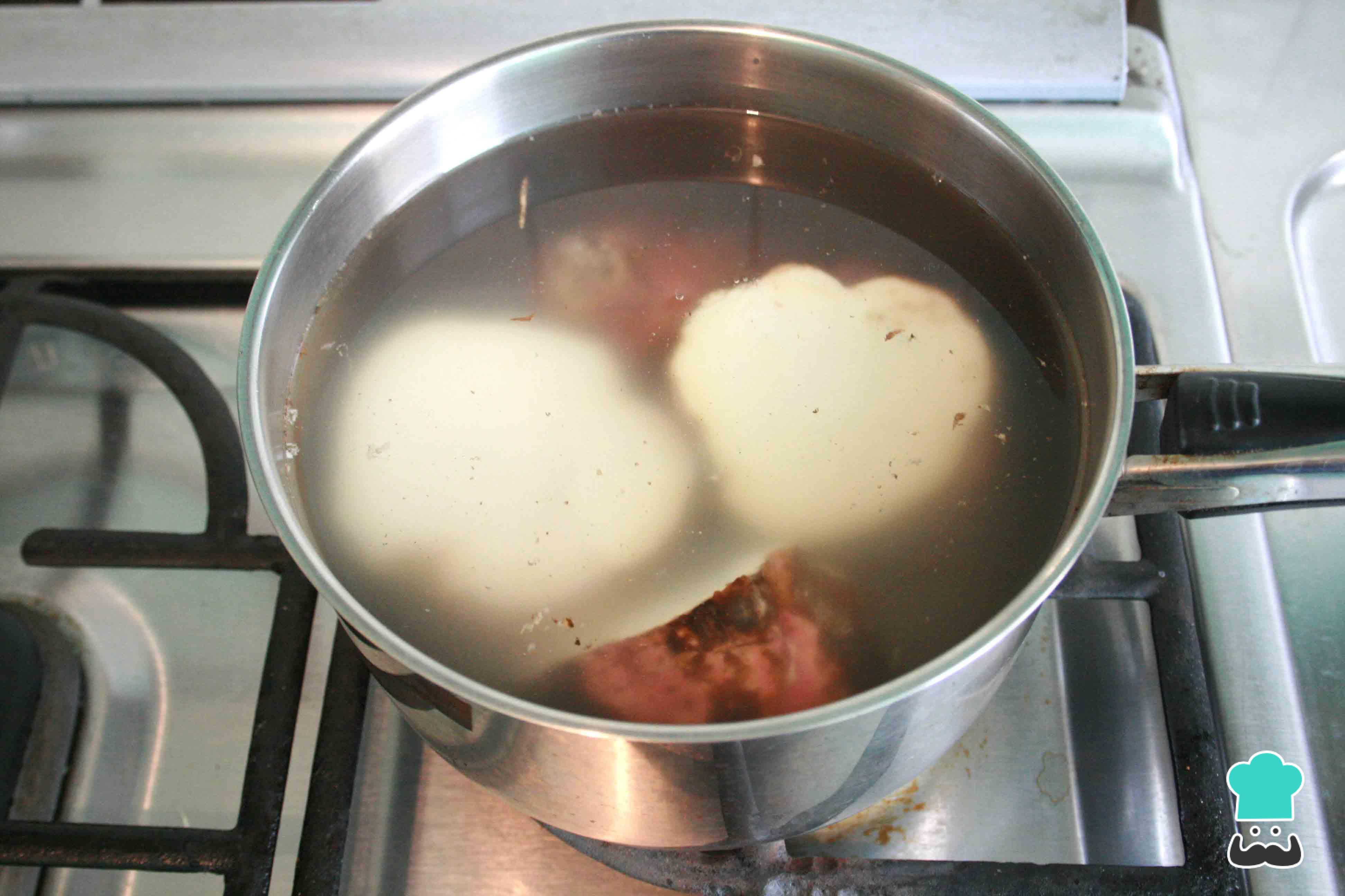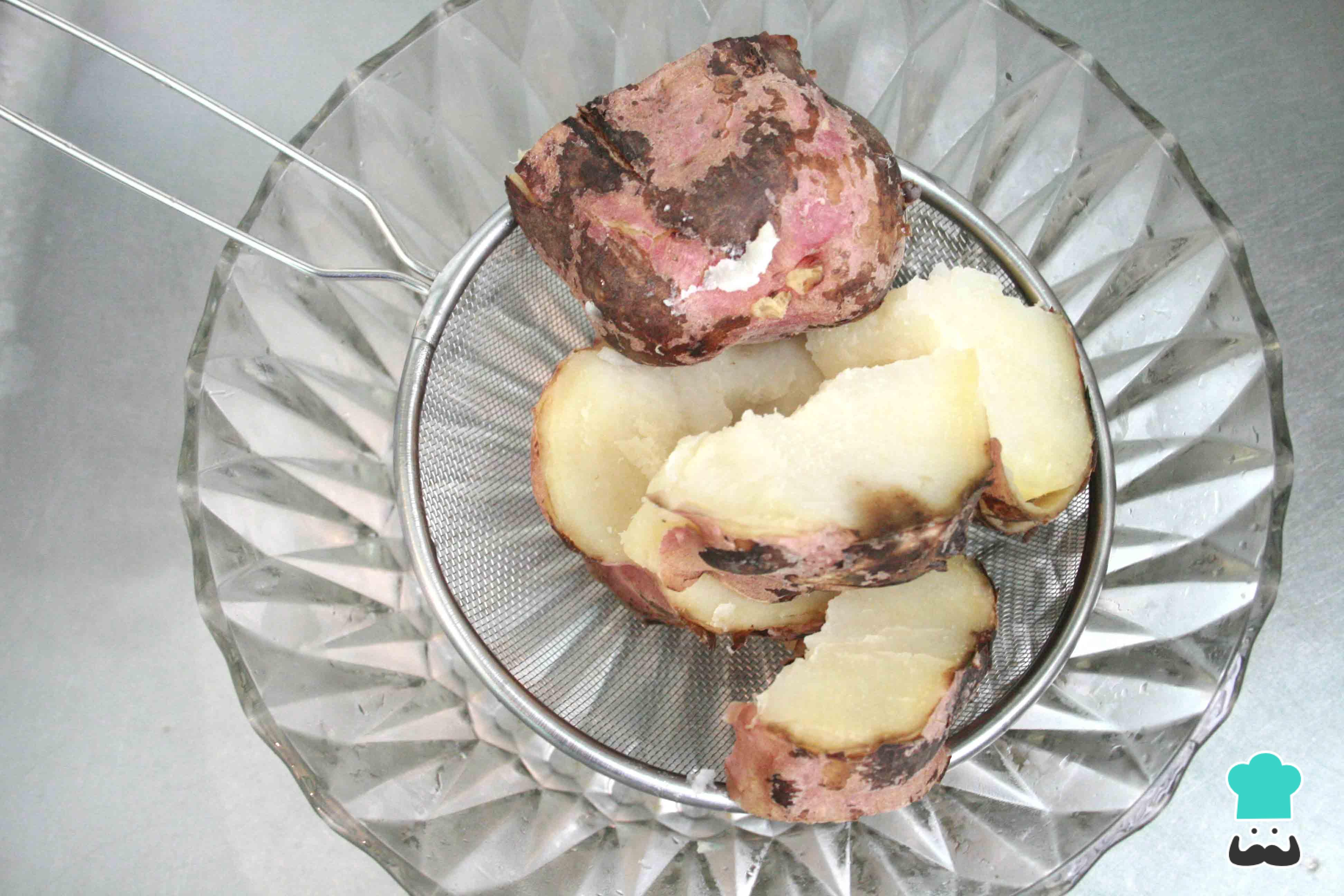 Escurre las batatas y espera un rato hasta que no quede nada de agua. Retira la concha y desecha. Reserva la batata.