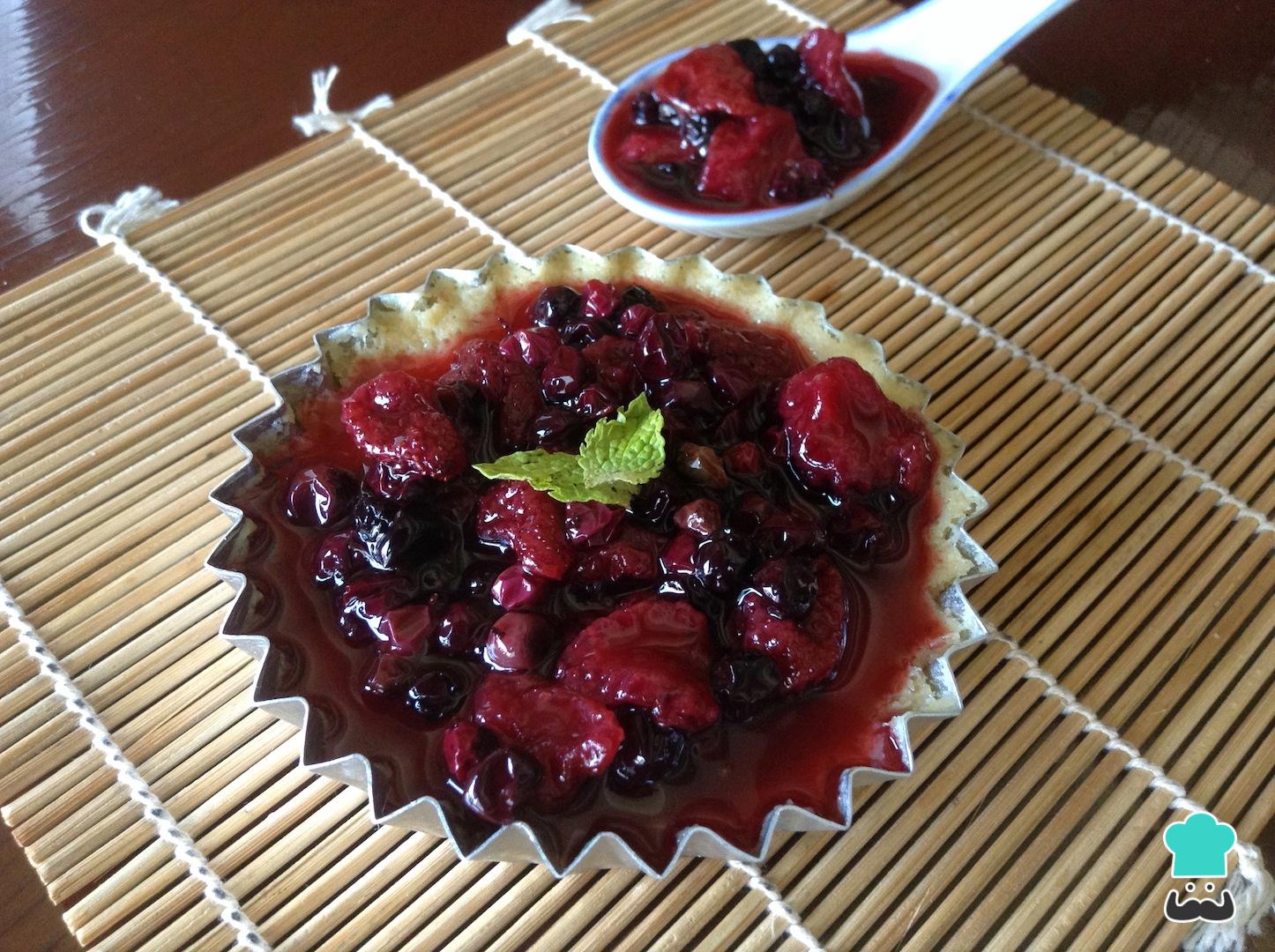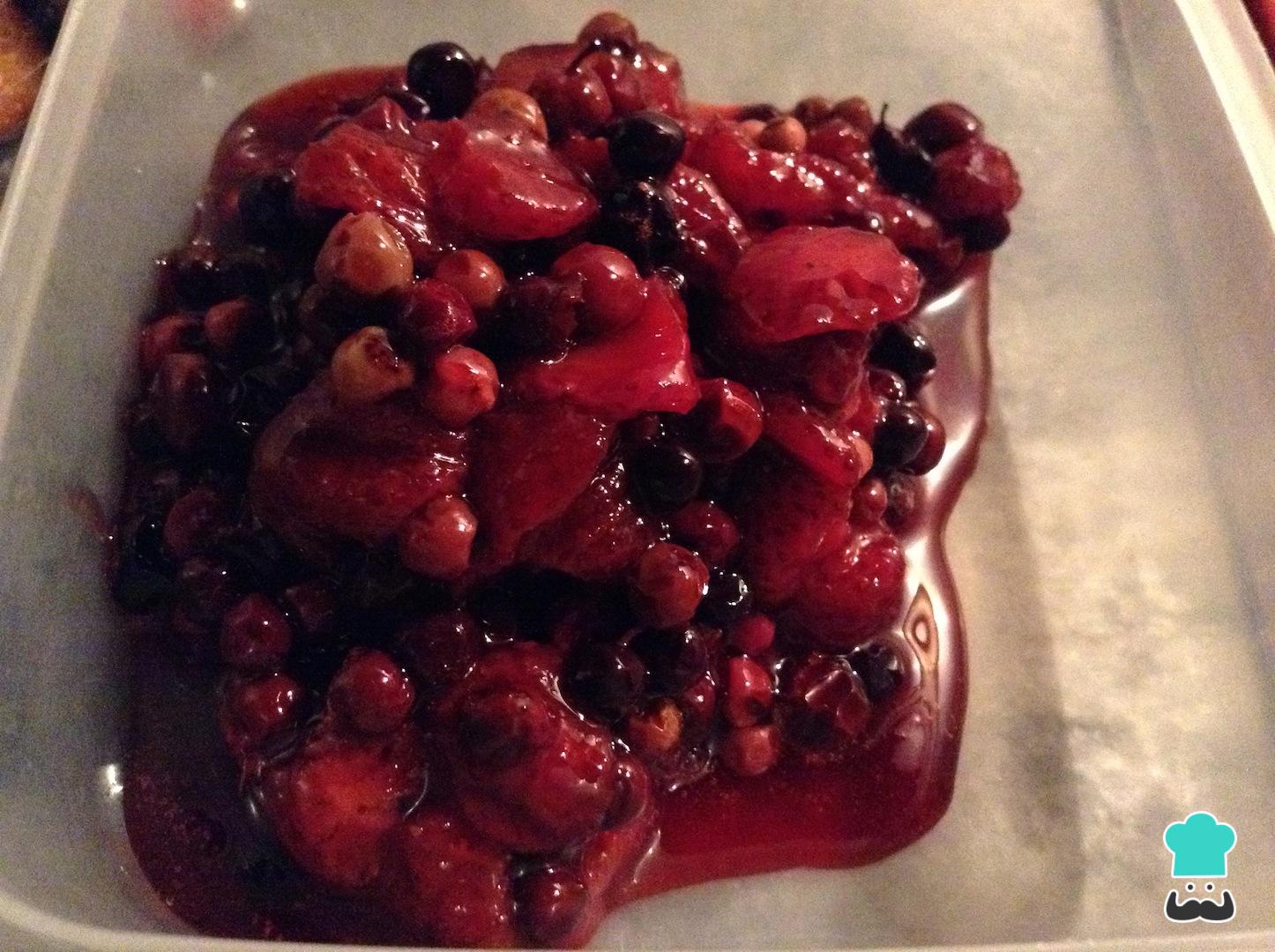 Deja enfriar la salsa de frutos rojos para utilizarla cuando la tarta de queso y chocolate blanco esté lista. Si quieres, puedes consultar la receta de la salsa de frutos rojos para más detalles e información sobre su preparación.
