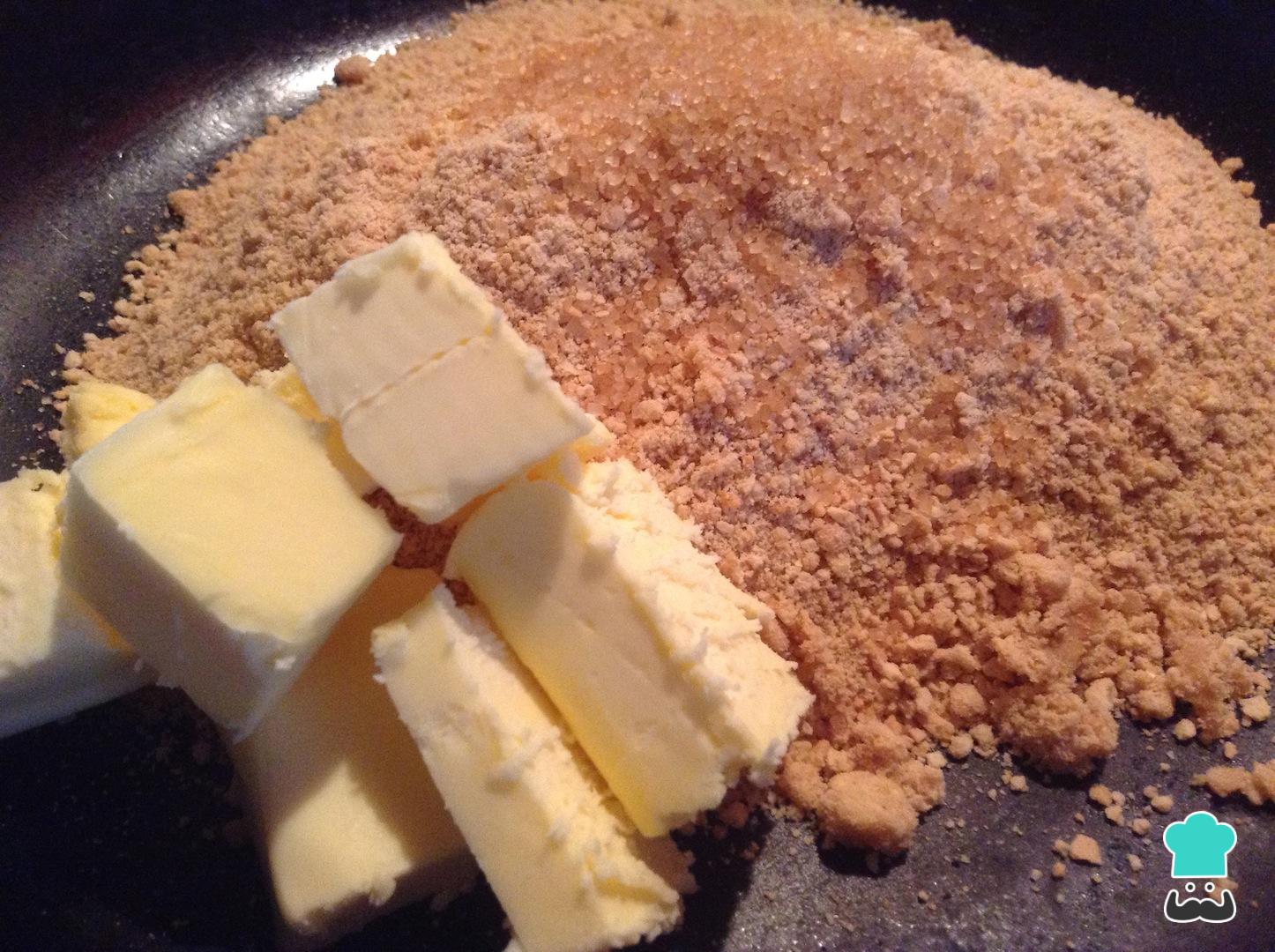 Como toda tarta de queso horneada, empieza la receta por la base. Para ello, lleva una sartén a fuego medio, añade la mantequilla que se indica en los ingredientes para la base y las galletas dulces trituradas. Deja que se cocinen hasta formar una pasta con la que deberás cubrir la base del molde para cheesecake más adelante.