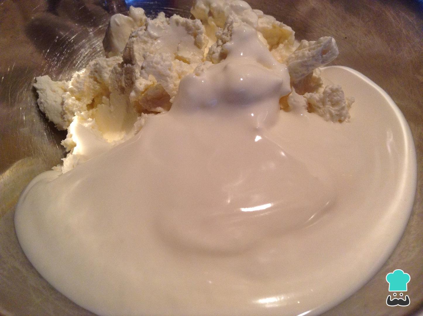 Ahora ha llegado el momento de preparar el relleno de la tarta de queso. Entonces, en un tazón hondo añade el queso crema y el yogur griego. Bate muy bien con la ayuda de un batidor manual o eléctrico hasta que los ingredientes se integren.