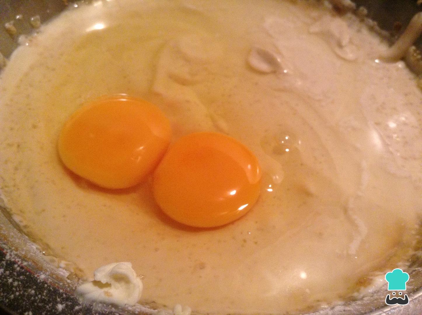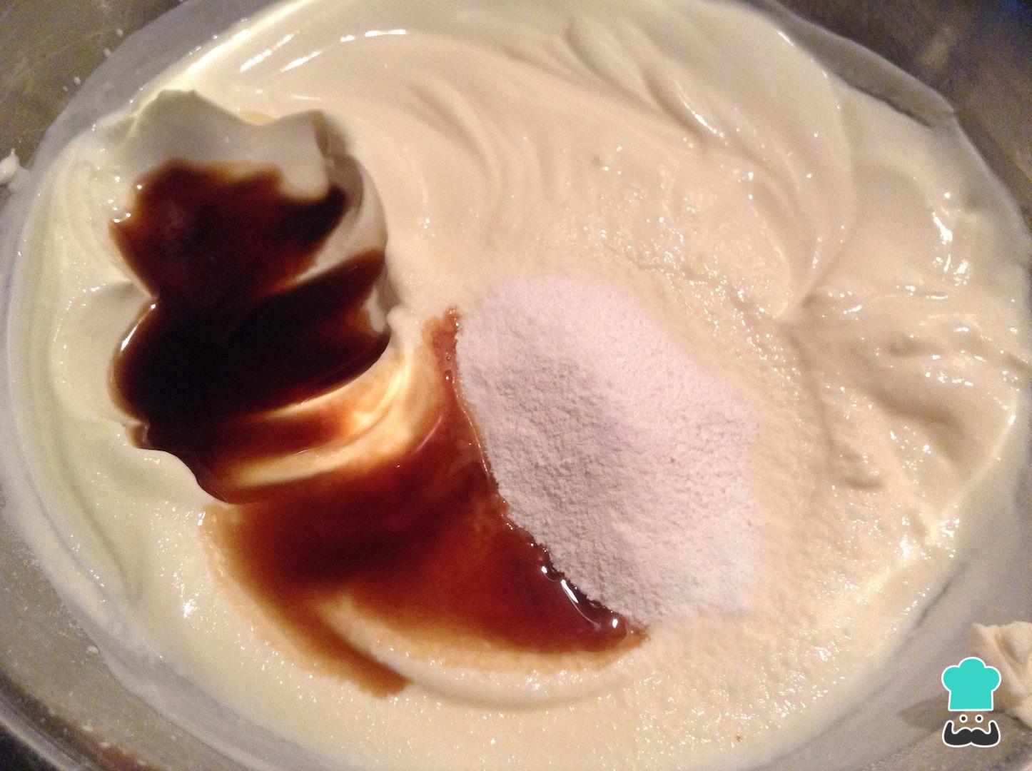 Una vez se mezclen los ingredientes del paso anterior, añade la esencia de vainilla y la maicena o fécula de maíz, y mezcla durante unos tres minutos más. Lo ideal es que batas con la velocidad más baja del batidor para evitar incorporar mucho aire a la masa.