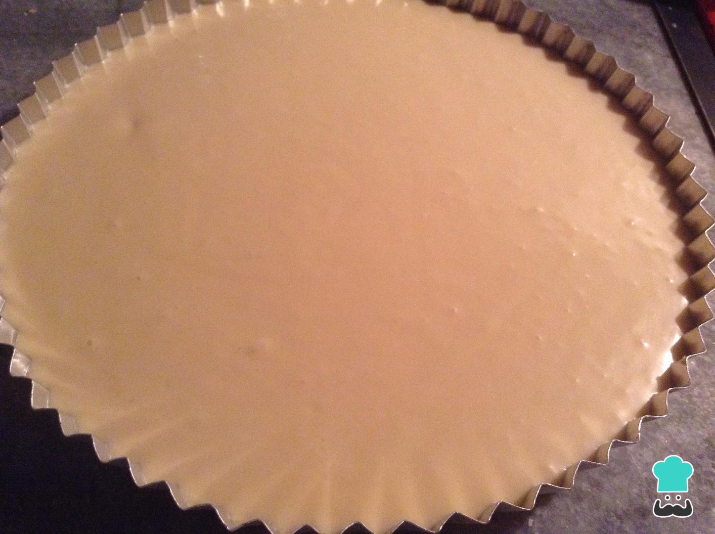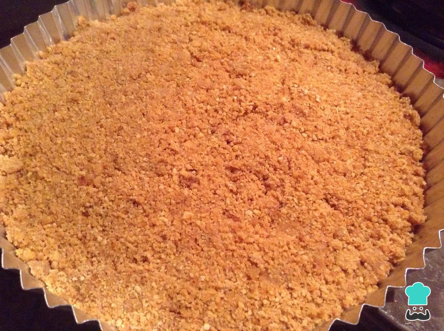 Con la ayuda de una espátula de cocina o cuchara agrega la base de galleta en el molde y extiéndela hasta cubrir todo el fondo. Debes ejercer presión sobre el molde para que se compacte bien. Deja reposar el molde con la base en el frigorífico durante unos 15 minutos, hasta que la pasta se encuentre dura.
