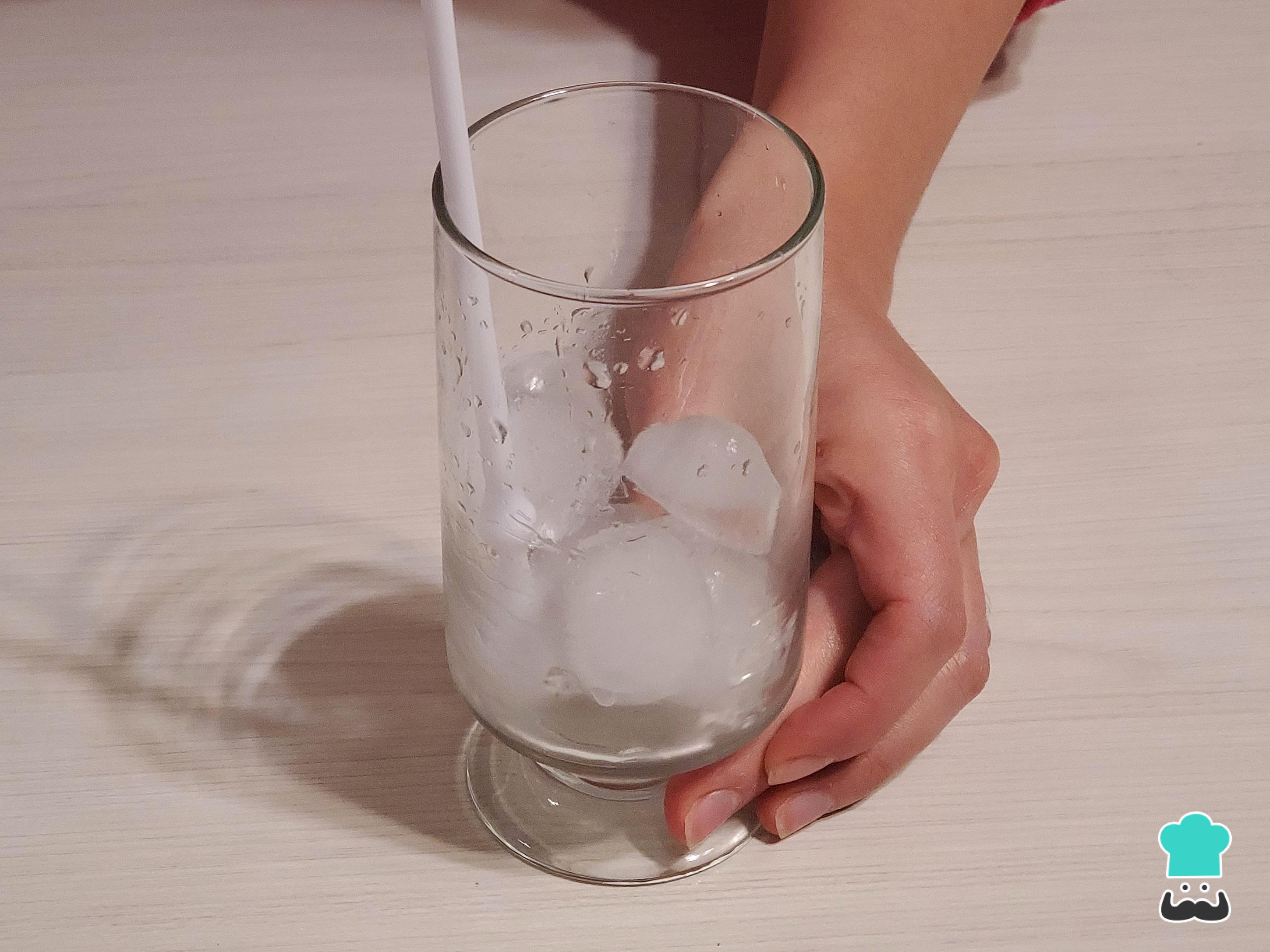 Para empezar a preparar este coctel, coloca unos cubos de hielo en un vaso alto y remuévelos con una cuchara larga para enfriar el vaso. Luego, reserva.