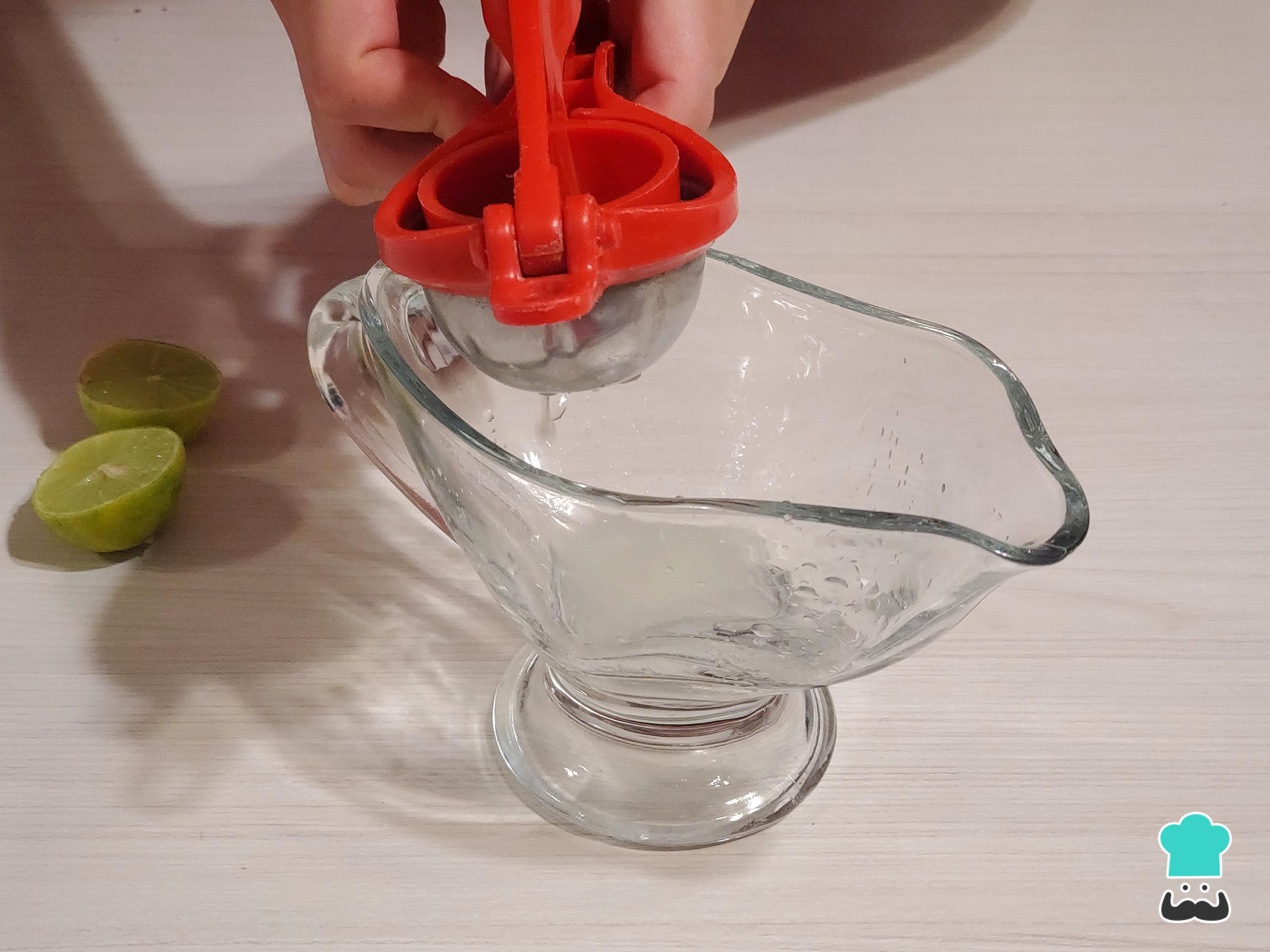 Aparte, corta los limones por la mitad y exprímelos con cuidado, extrayendo solo el jugo sin aplastar demasiado para evitar que los aceites amargos de la cáscara se mezclen. Seguidamente, cuela el jugo de limón para eliminar cualquier pulpa o semilla.