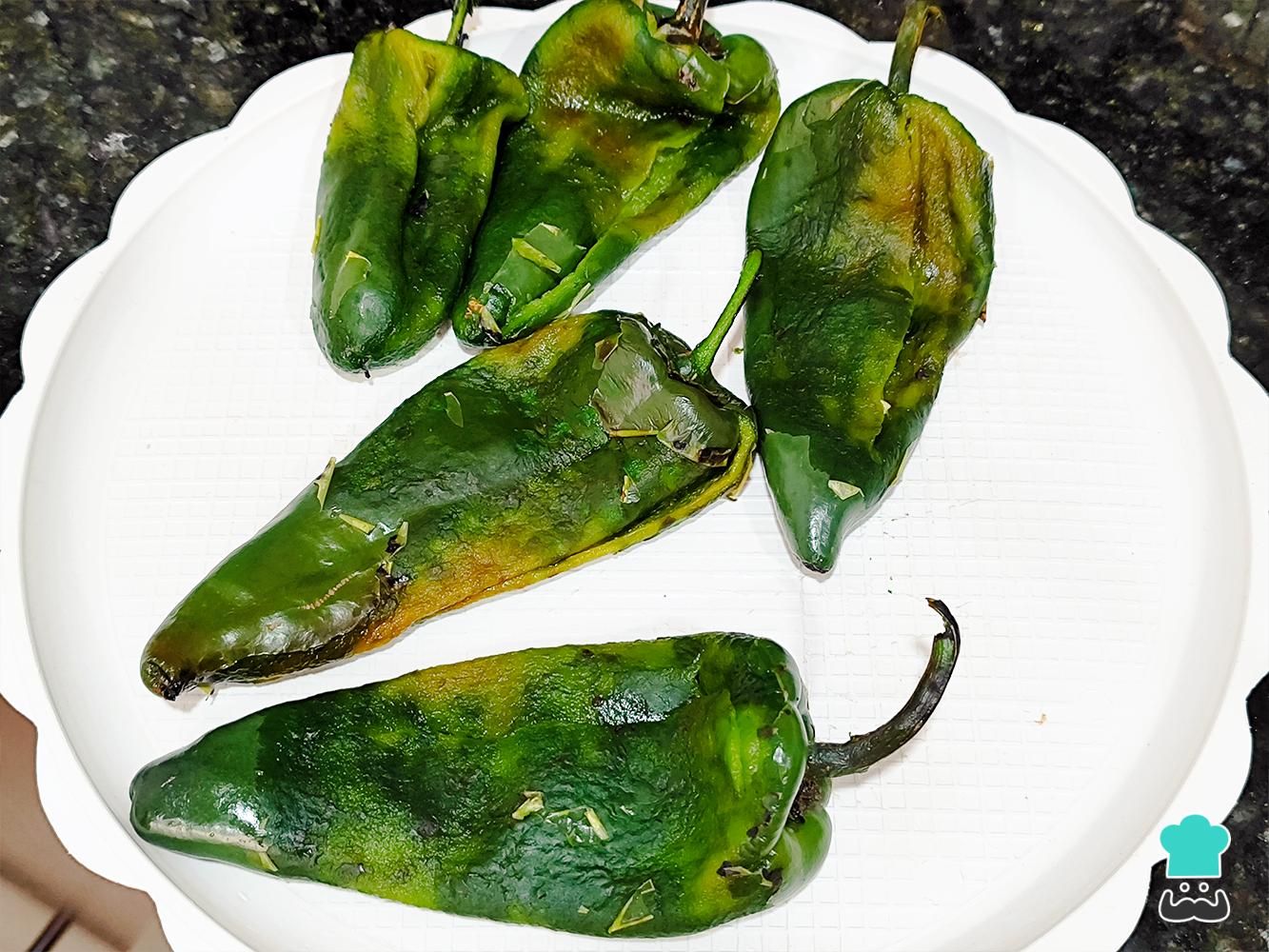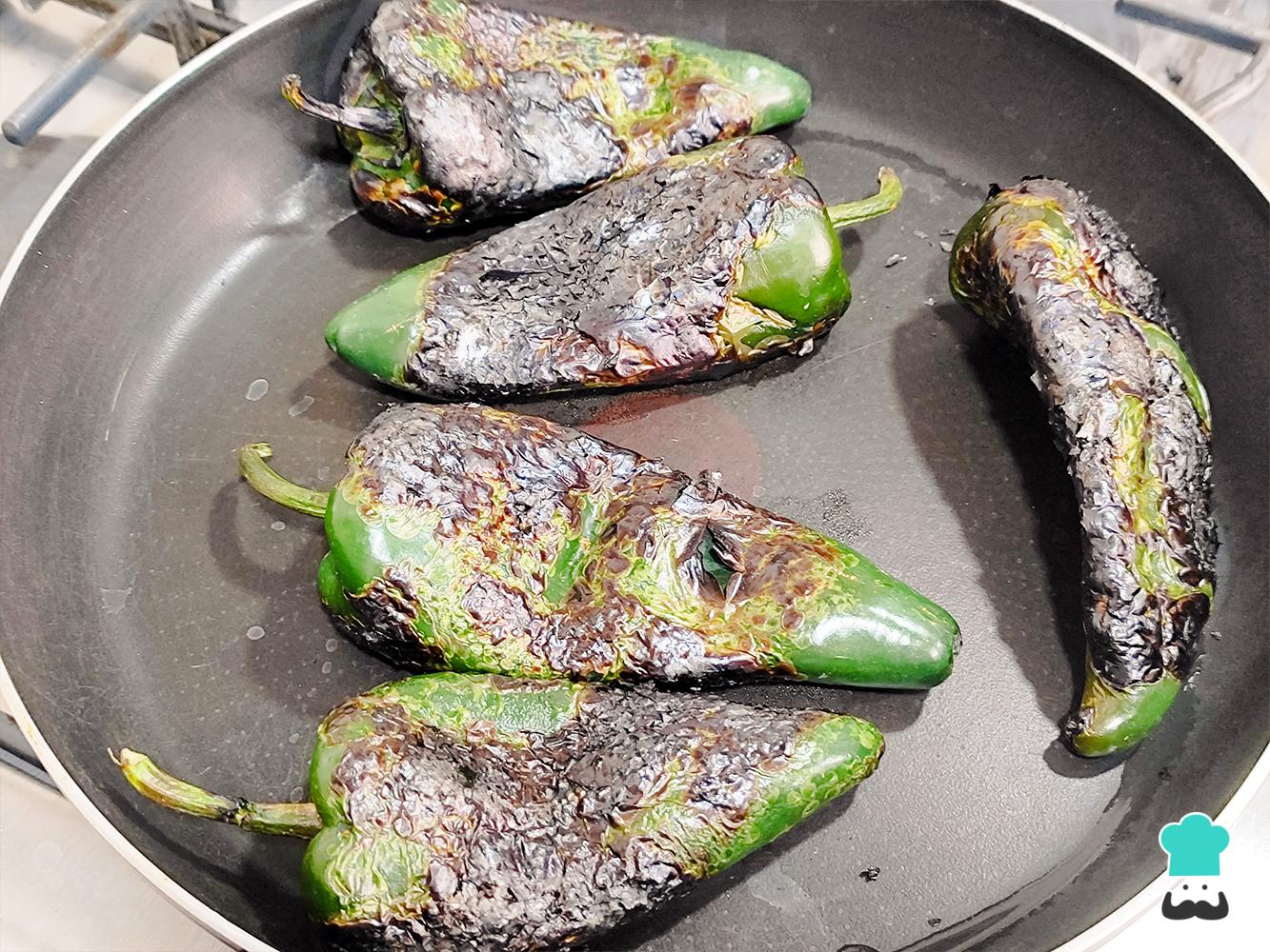 Comienza por asar los chiles poblanos directamente sobre el fuego o sobre un comal o sartén hasta que la piel se queme. A continuación, introduce en una bolsa de plástico y déjalos sudar.