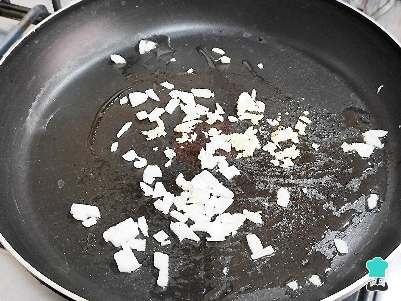 En una sartén sofríe la cebolla y el ajo con un poco de aceite, remueve constantemente para que ninguno de los ingredientes se queme. La cebolla debe quedar ligeramente transparente y el ajo dorado.