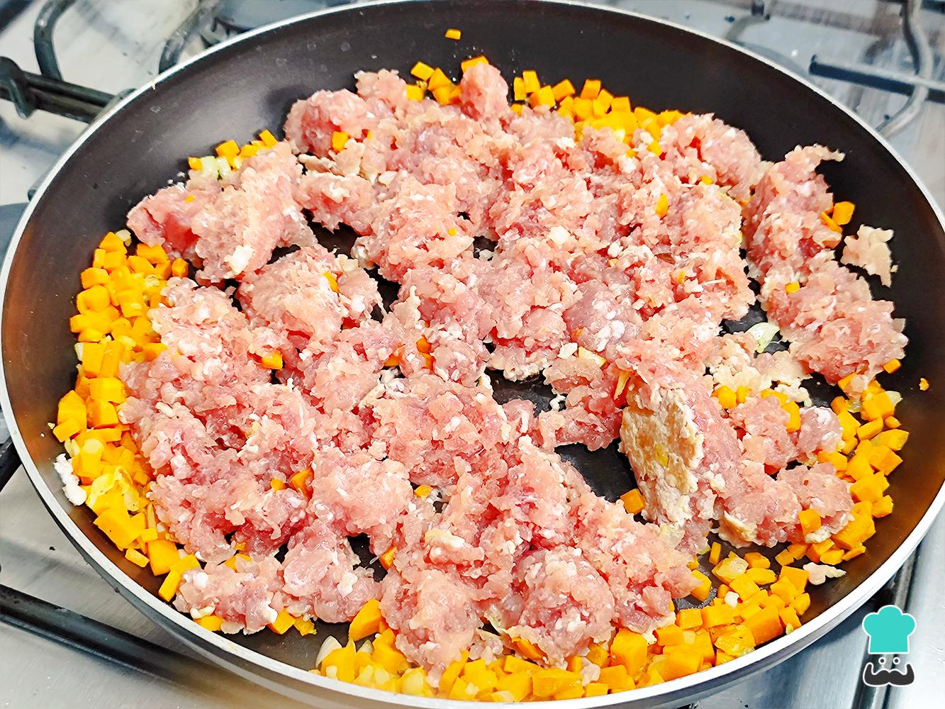 Agrega la zanahoria y la carne molida, cocina a fuego medio y mezcla para integrar todo, añade sal y pimienta al gusto. Deja cocinar por 10 minutos, luego retira del fuego.