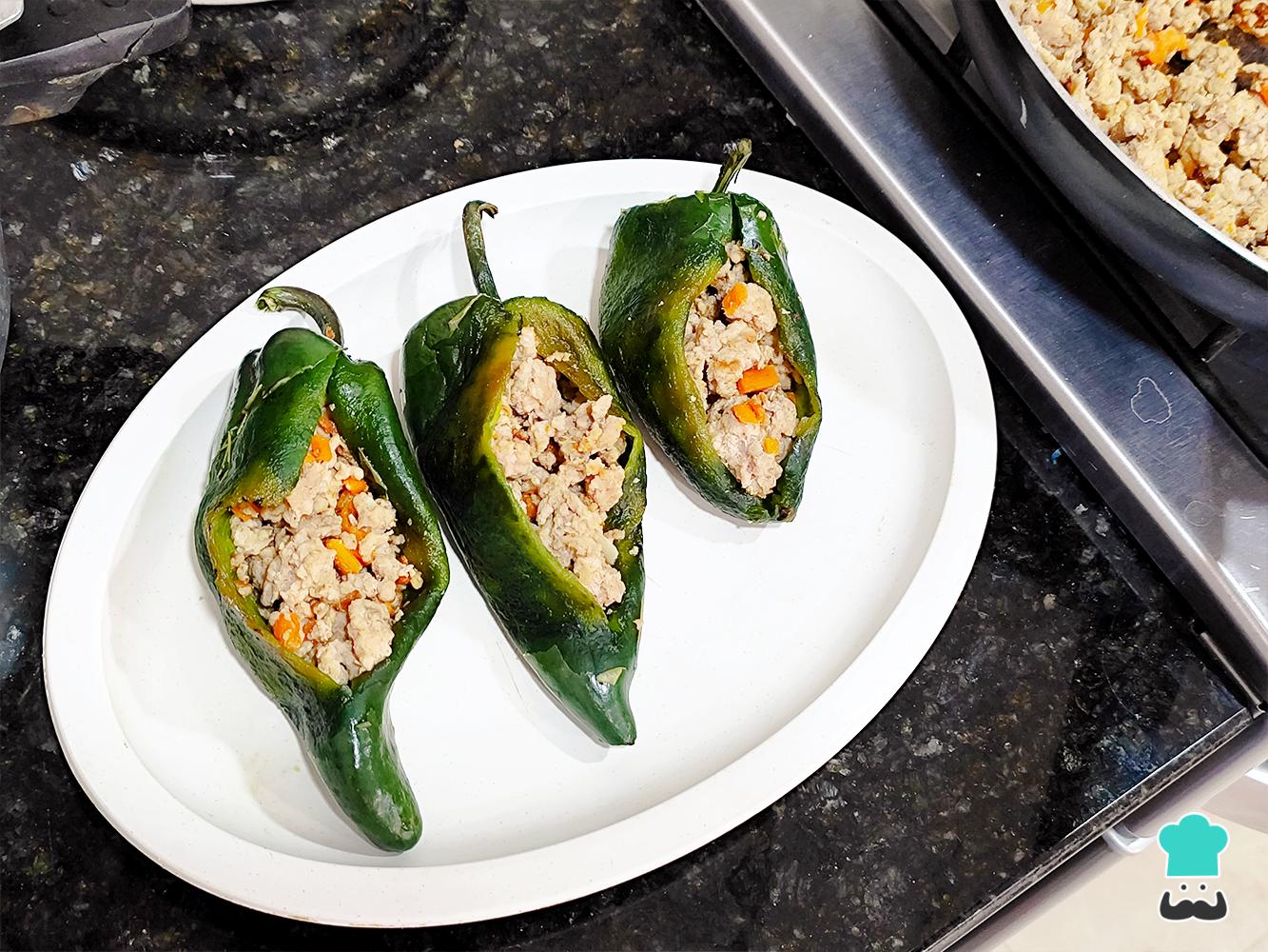Pela los chiles poblanos rellenos, haz un corte a lo largo y retira las semillas sin romper el chile. Luego, reserva.