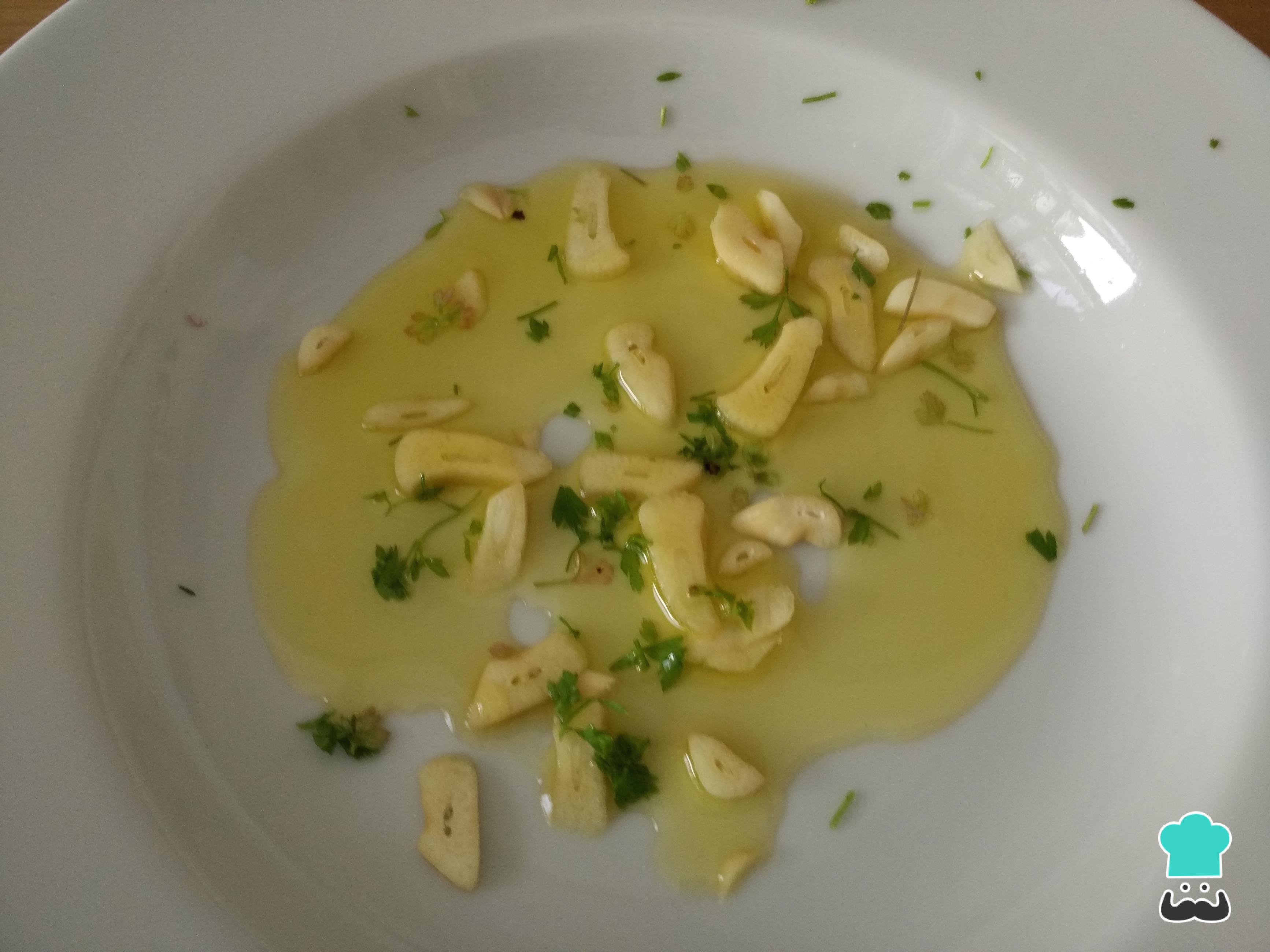 En un bol hacemos un aderezo con aceite de oliva, los ajos fileteados y el perejil picado. Si os gusta el picante, podéis añadir un poco de pimienta de Cayena molida, también conocida como pimienta roja.