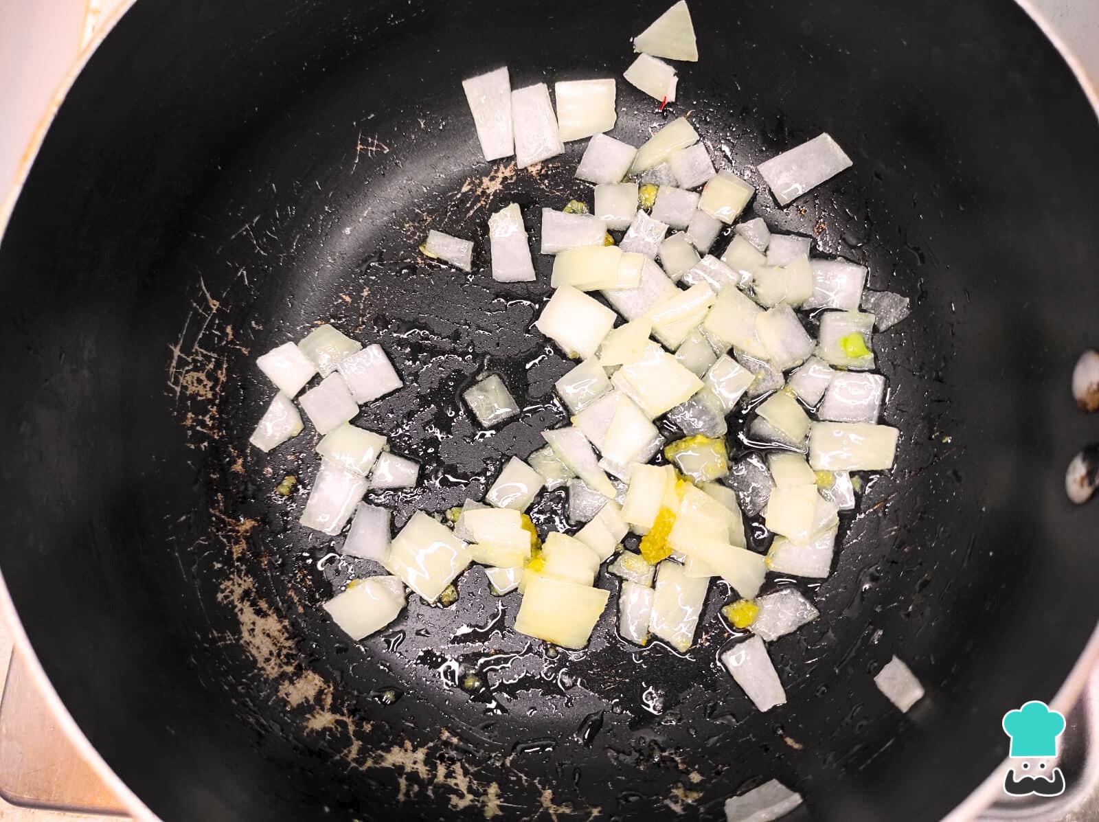 Sofríe la cebolla picada en cubitos pequeños y el diente de ajo en un sartén, añade los aliños y deja en el fuego medio hasta que se dore por unos 2-3 minutos.