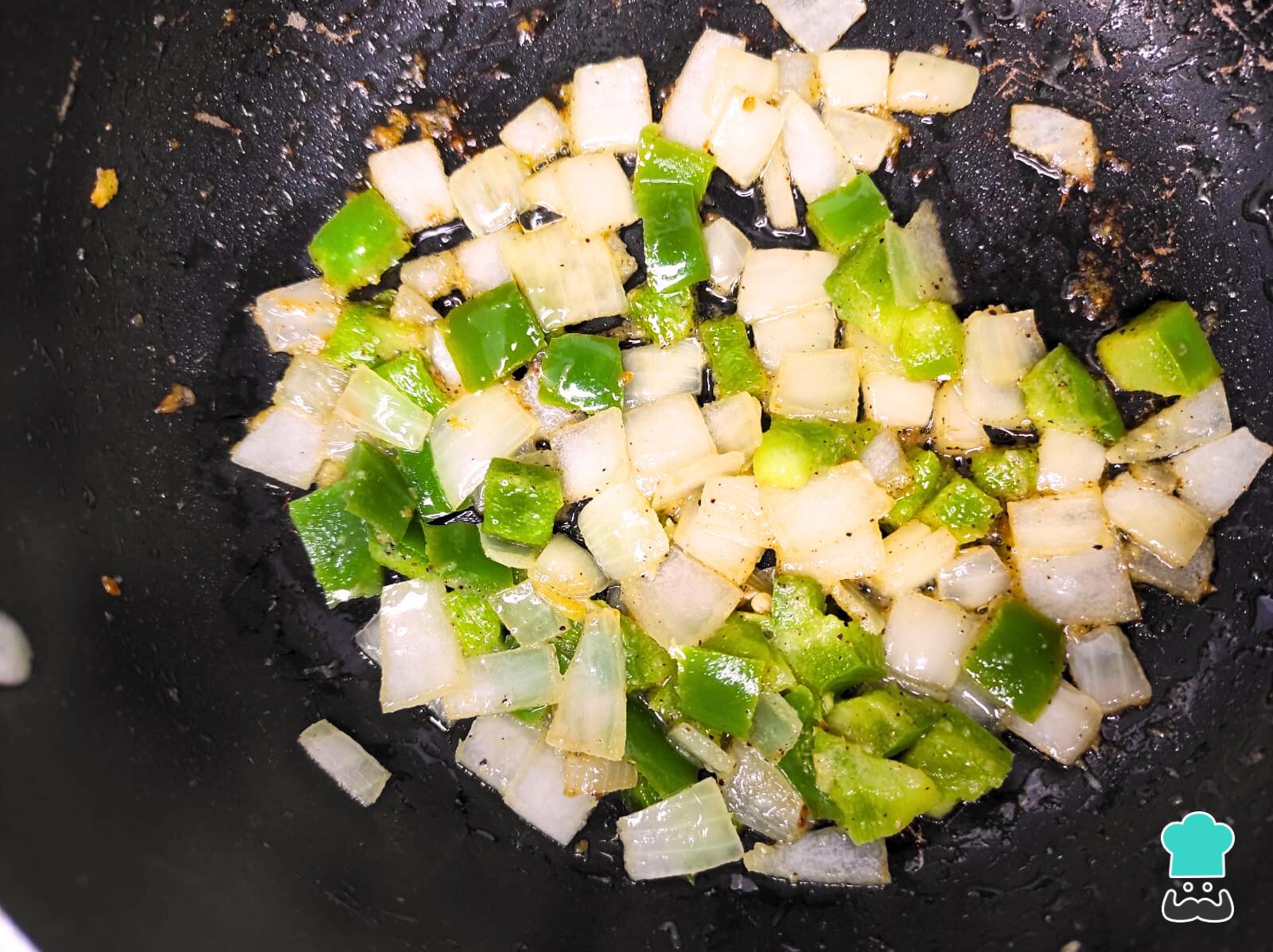 Agrega el pimiento picado en cubitos y sofríe por otro minuto más.