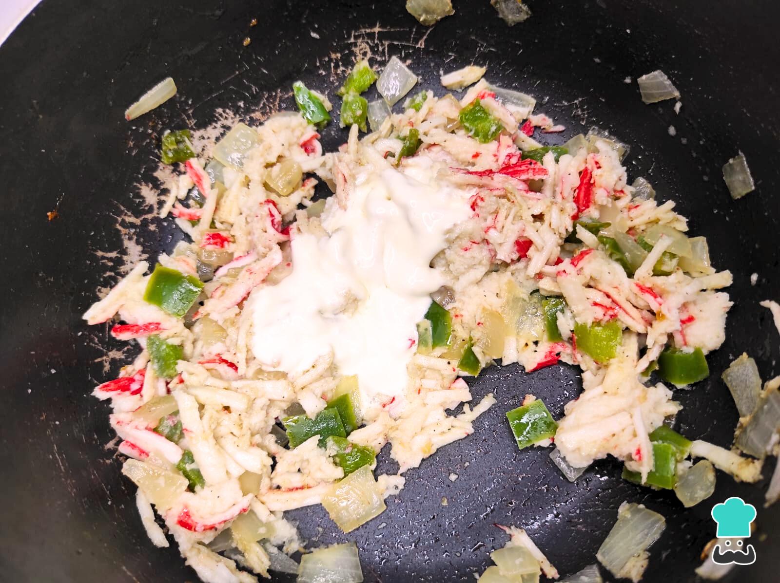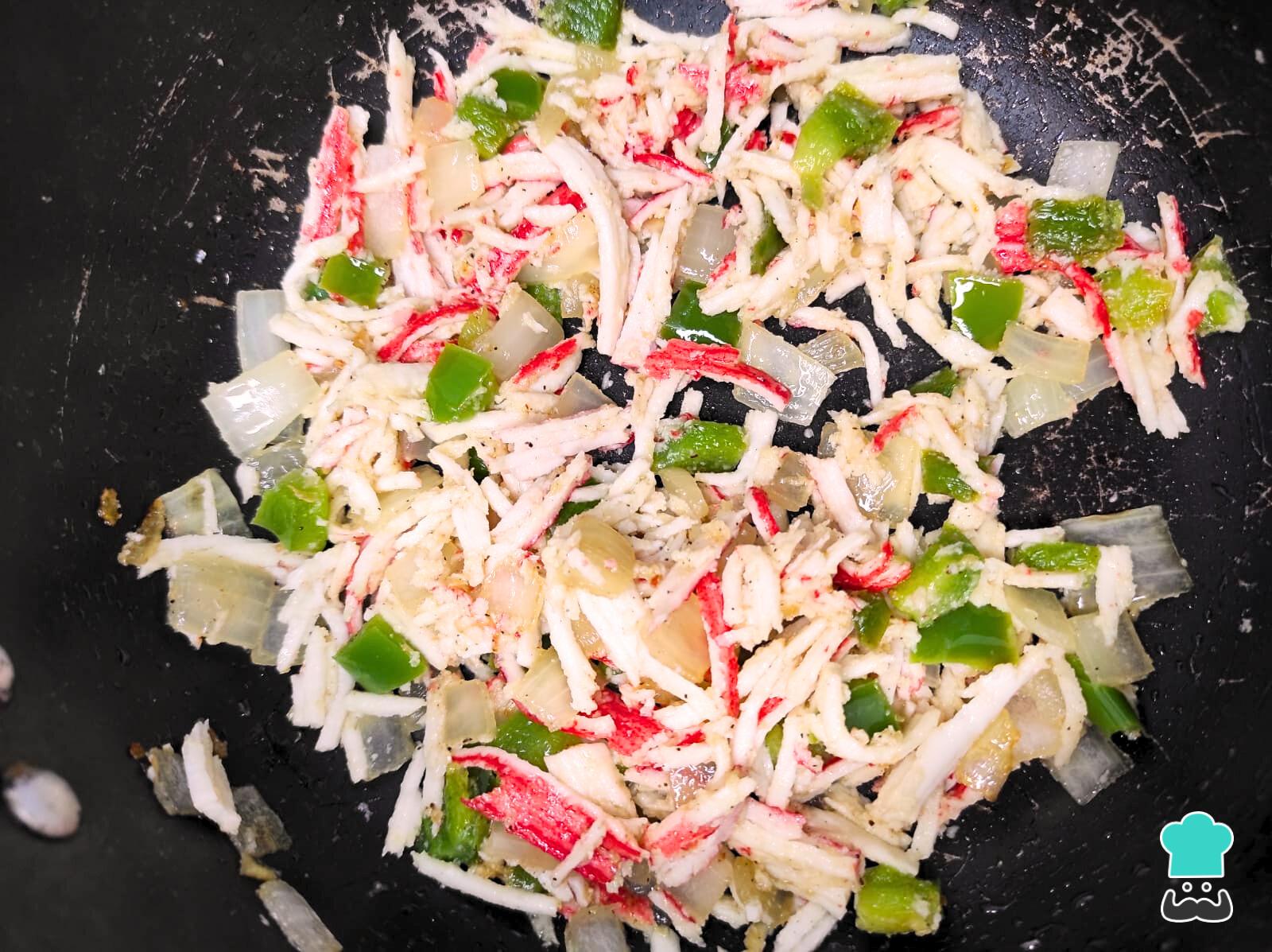 Incorpora la carne de centolla al sartén y mezcla a fuego medio por 2 minutos. Añade más aceite de ser necesario.