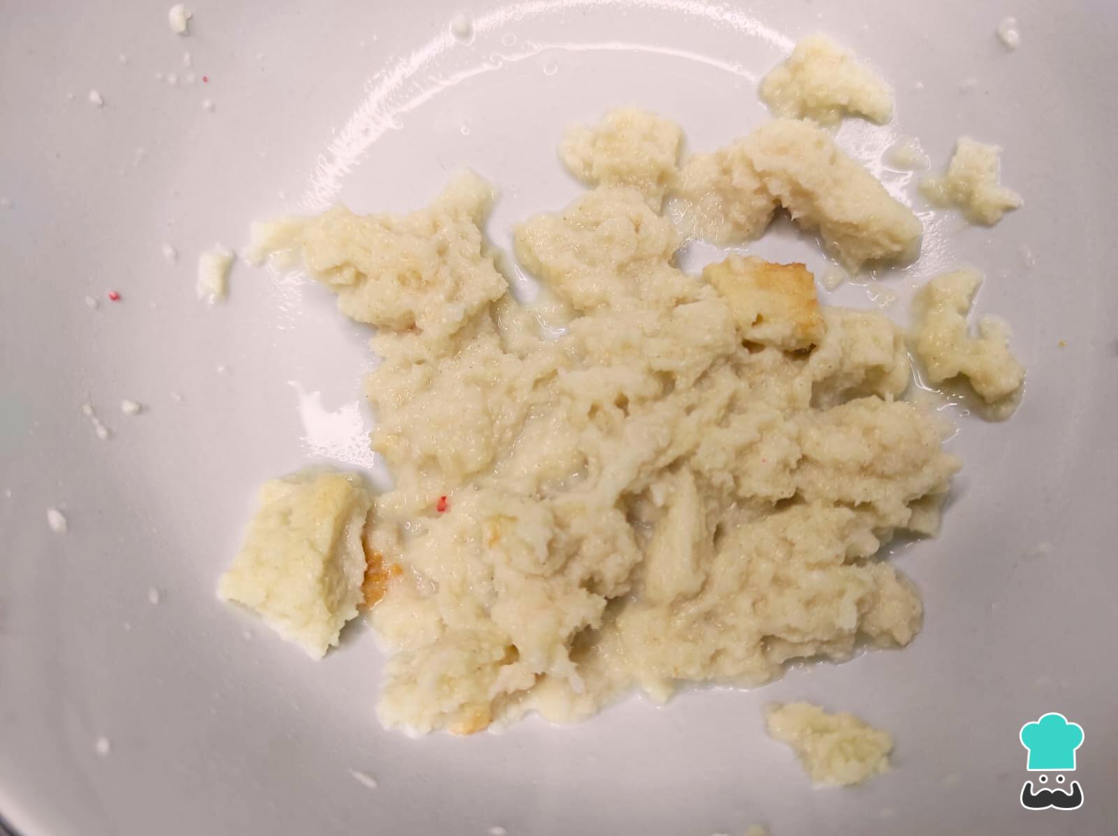 En un bowl aparte, desmenuza el pan de molde y mézclalo junto con la leche para formar una pasta.