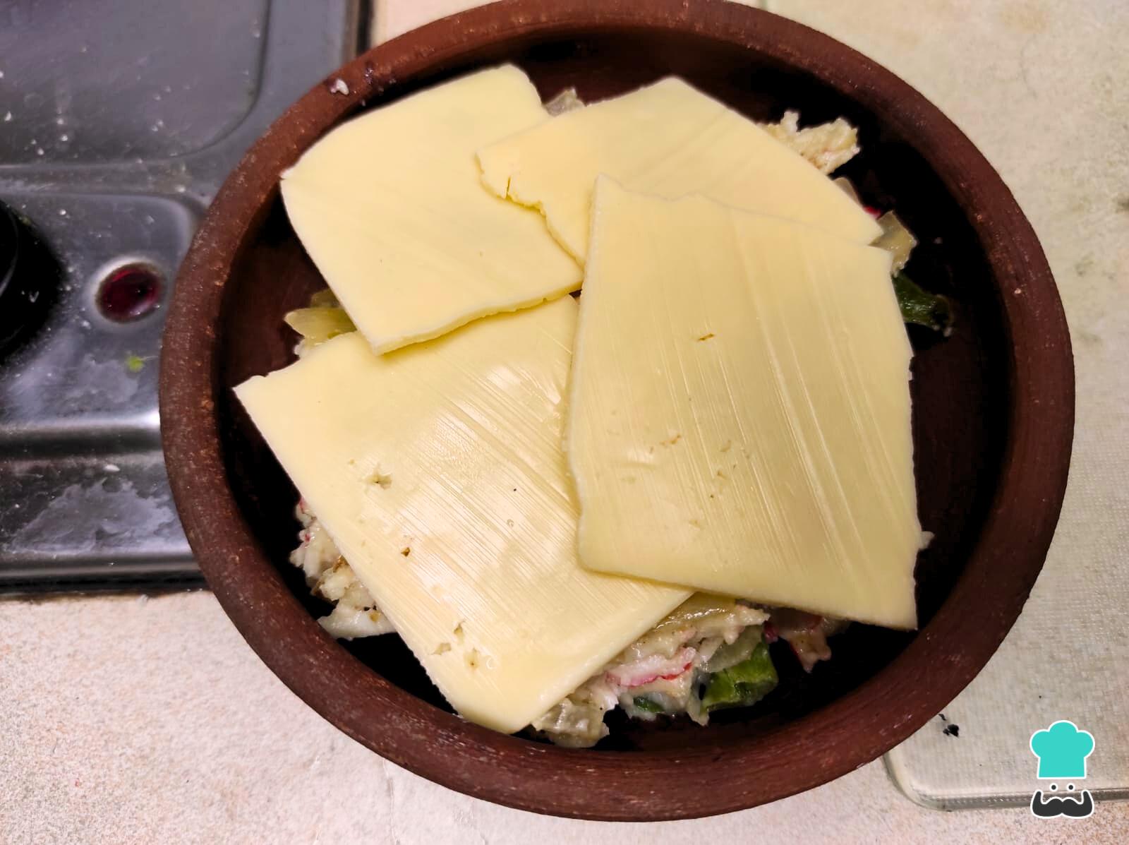 Sirve las porciones en pocillos individuales aptos para horno y corona la preparación con láminas de queso.