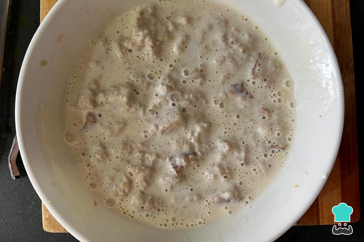 Pica el pan y ponlo a remojar con la leche líquida y la crema de leche.