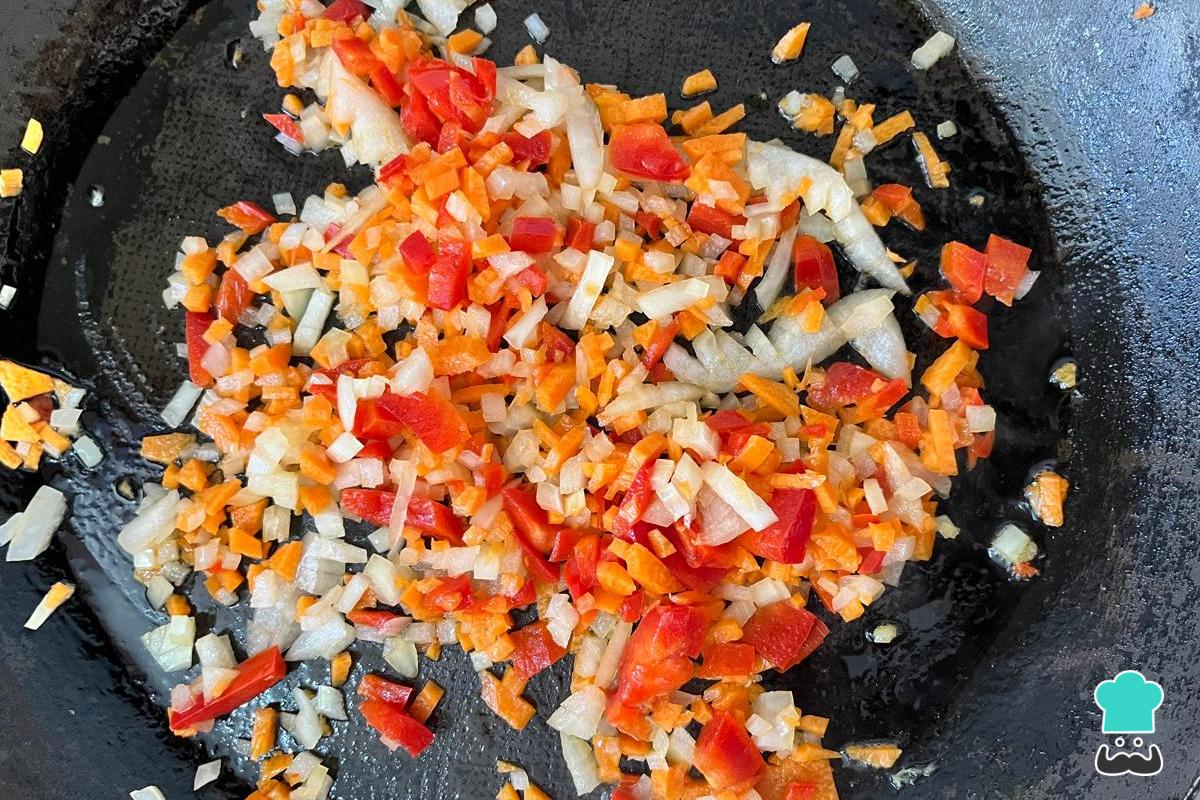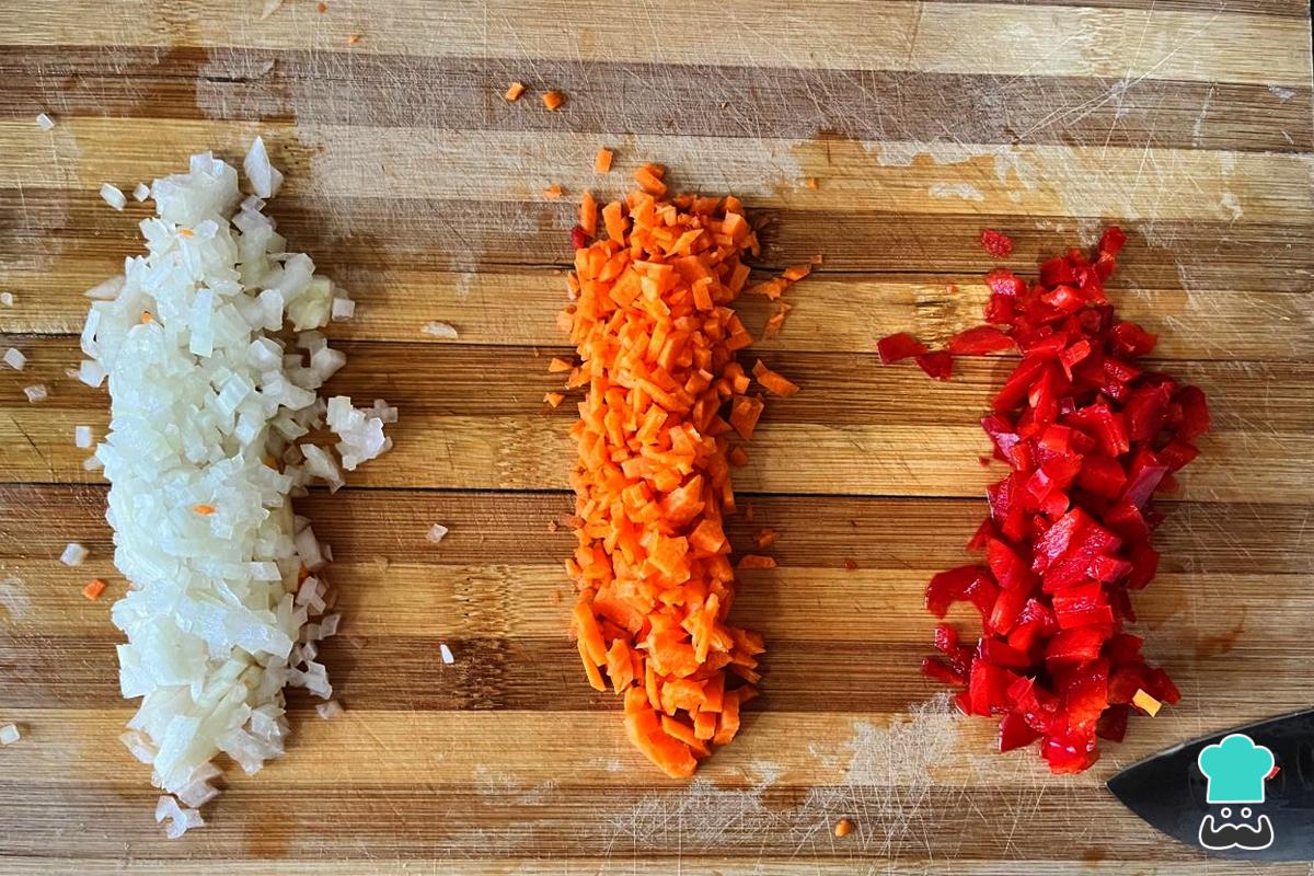 Corta en cubos pequeños la zanahoria, el pimentón, la cebolla y el ajo.