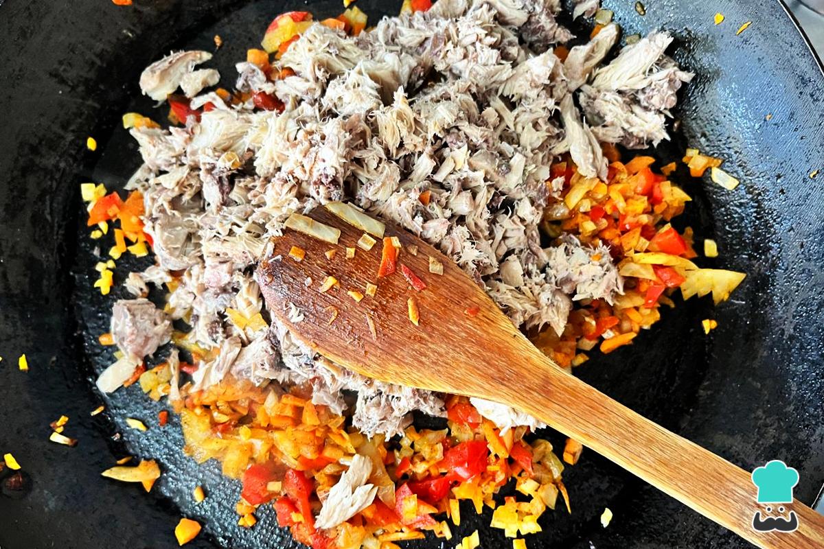 Añade al sofrito el jurel desmenuzado y remueve bien, añade las especias: orégano, paprika, sal y pimienta.