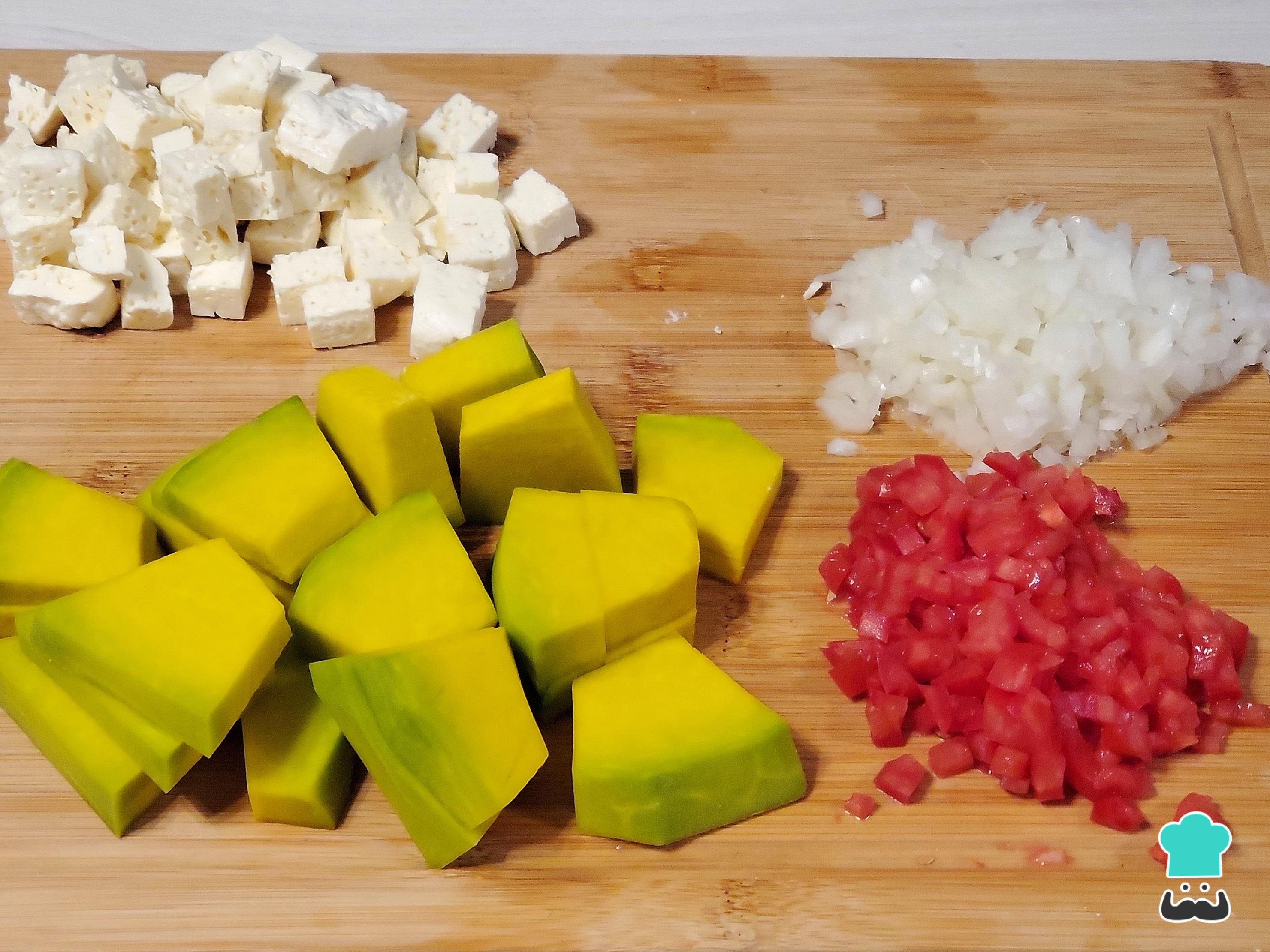 Empieza picando las verduras. Corta la cebolla finamente de la misma forma que el tomate, pero retira las semillas previamente. También retira la cáscara del zapallo y pica en trozos grandes del mismo tamaño. Por otro lado, corta el queso en cubos medianos.