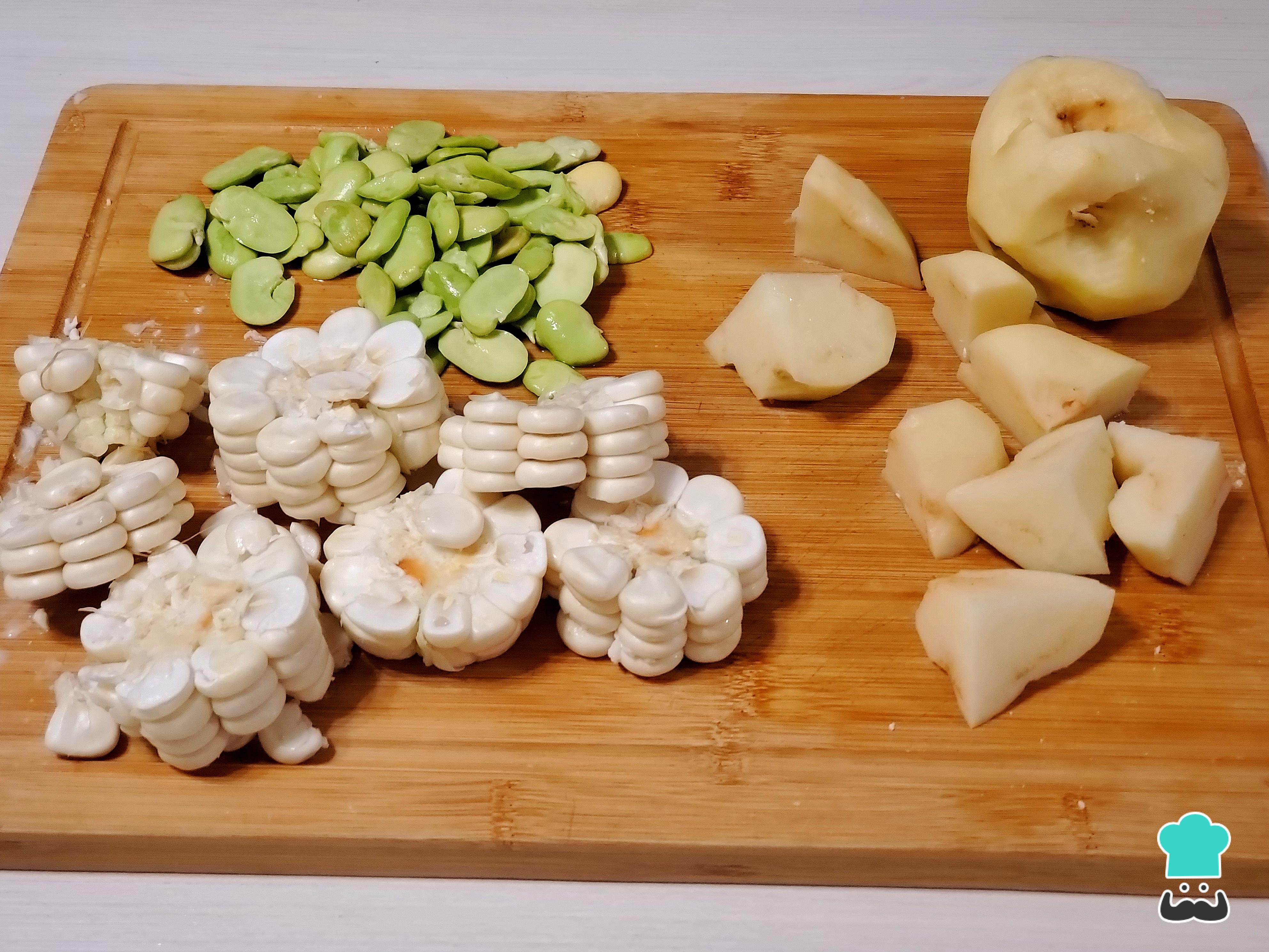 Aparte, pela las habas, es decir, retíralas de sus vainas. Lava bien, pela y retira los ojos a las papas, luego procede a cortarlas en cubos grandes del tamaño del zapallo. Por último, limpia los choclos y córtalos en rodajas de dos dedos de grosor aproximadamente.