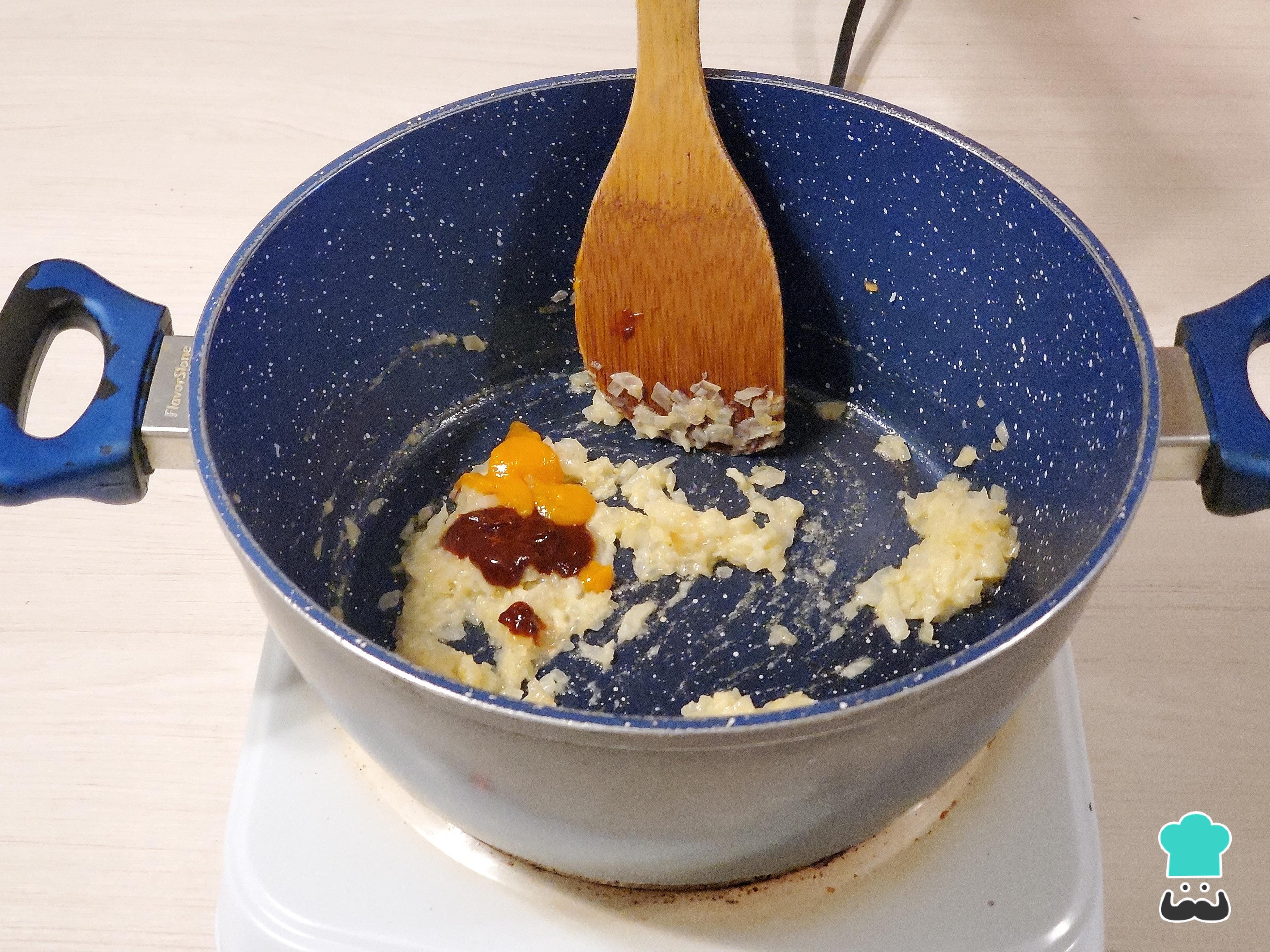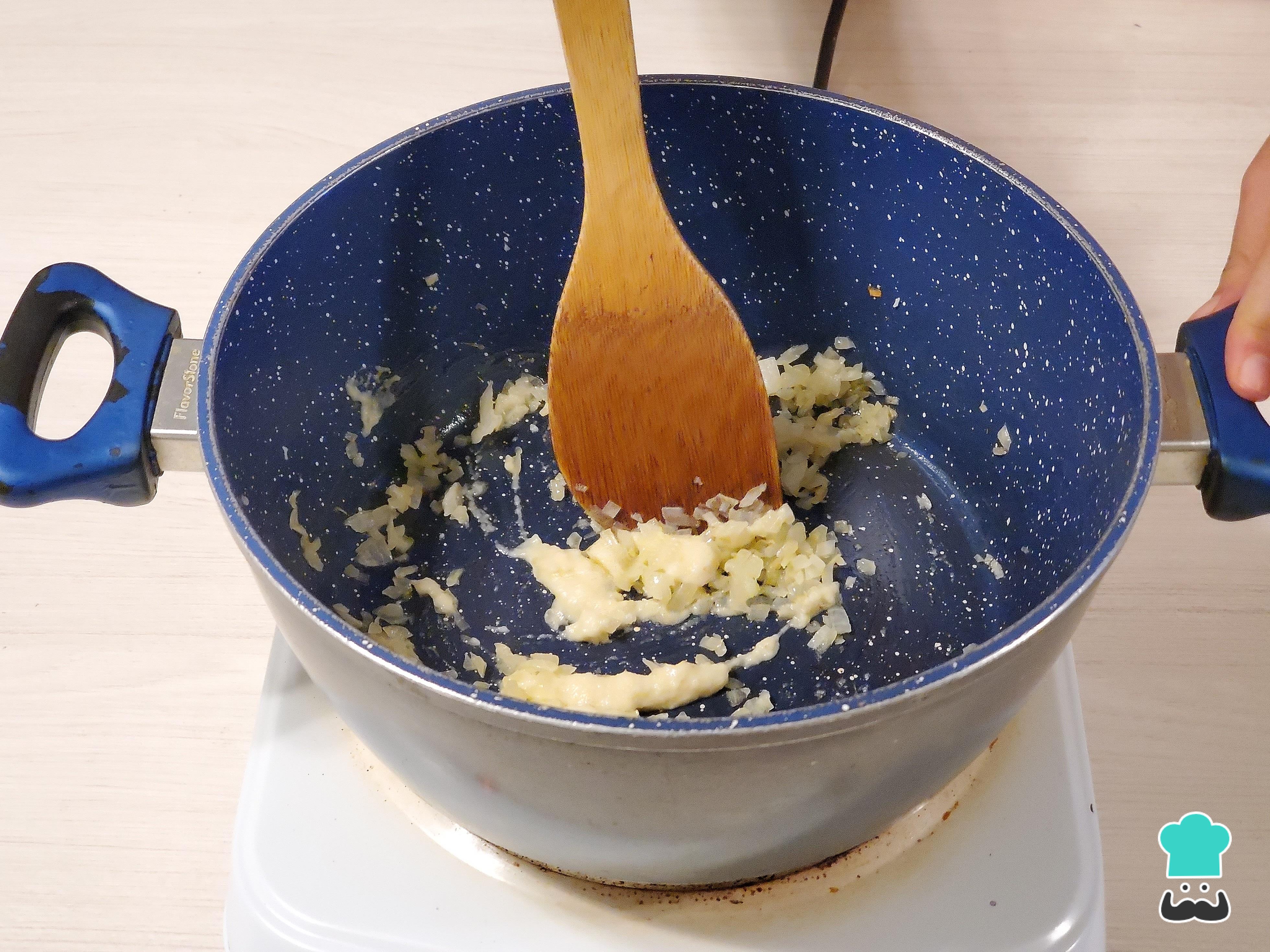 Truco: para evitar que el ajo o la cebolla se quemen, puedes echar un poco de agua cada vez que se empiece a pegar al fondo de la olla.