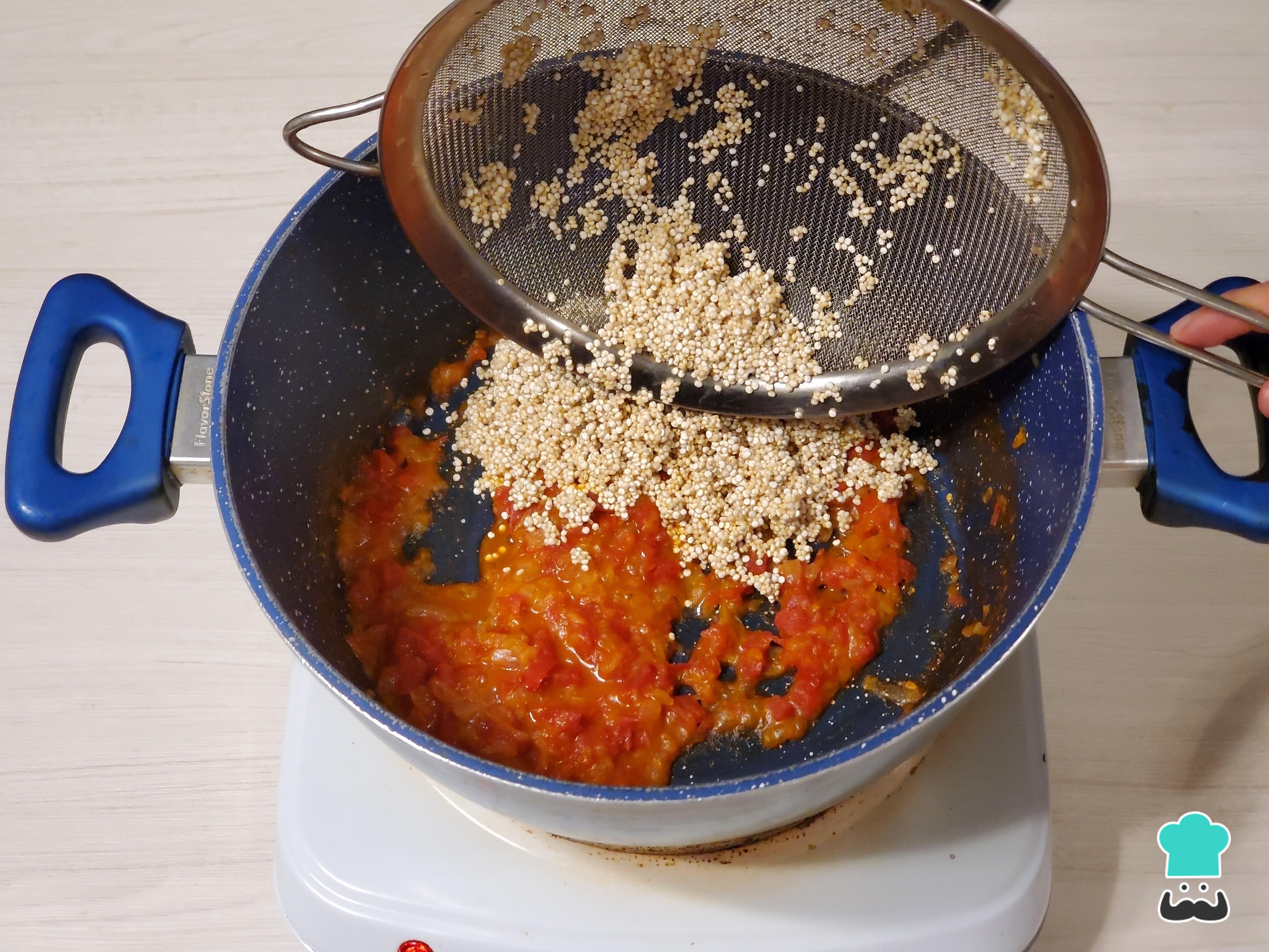 Cuando el tomate se observe deshecho, vierte la quinua limpia y cubre con abundante agua o caldo de ave o de res. Tapa la olla, aromatiza con una rama de huacatay, agrega sal al gusto y deja que hierva por 30 minutos aproximadamente o hasta que la quinua haya reventado y se sienta suave.
