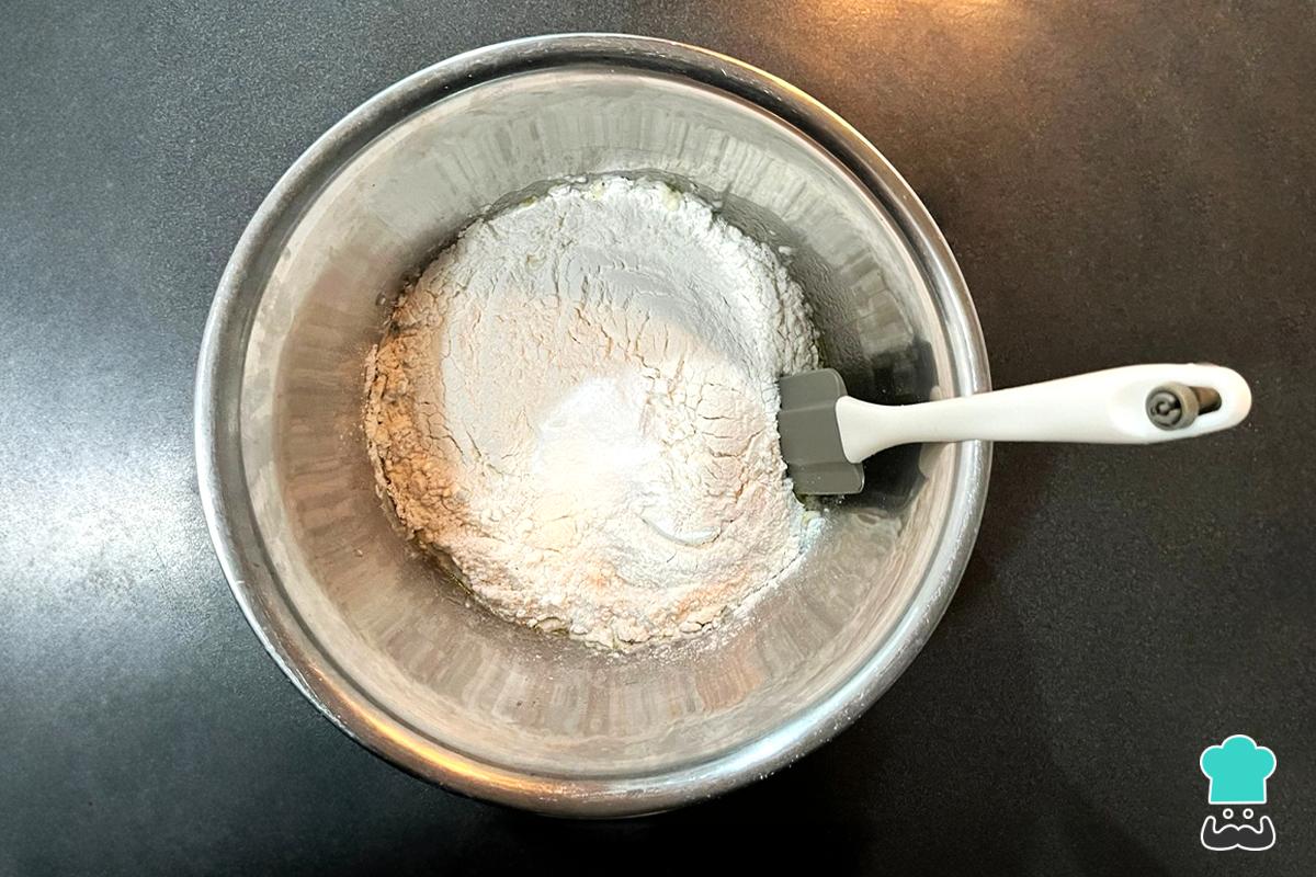 Para preparar la masa, en un bol grande mezcla la harina, la sal y el polvo de hornear. Añade la mantequilla y agua tibia, mezcla con las manos hasta incorporar todos los ingredientes.