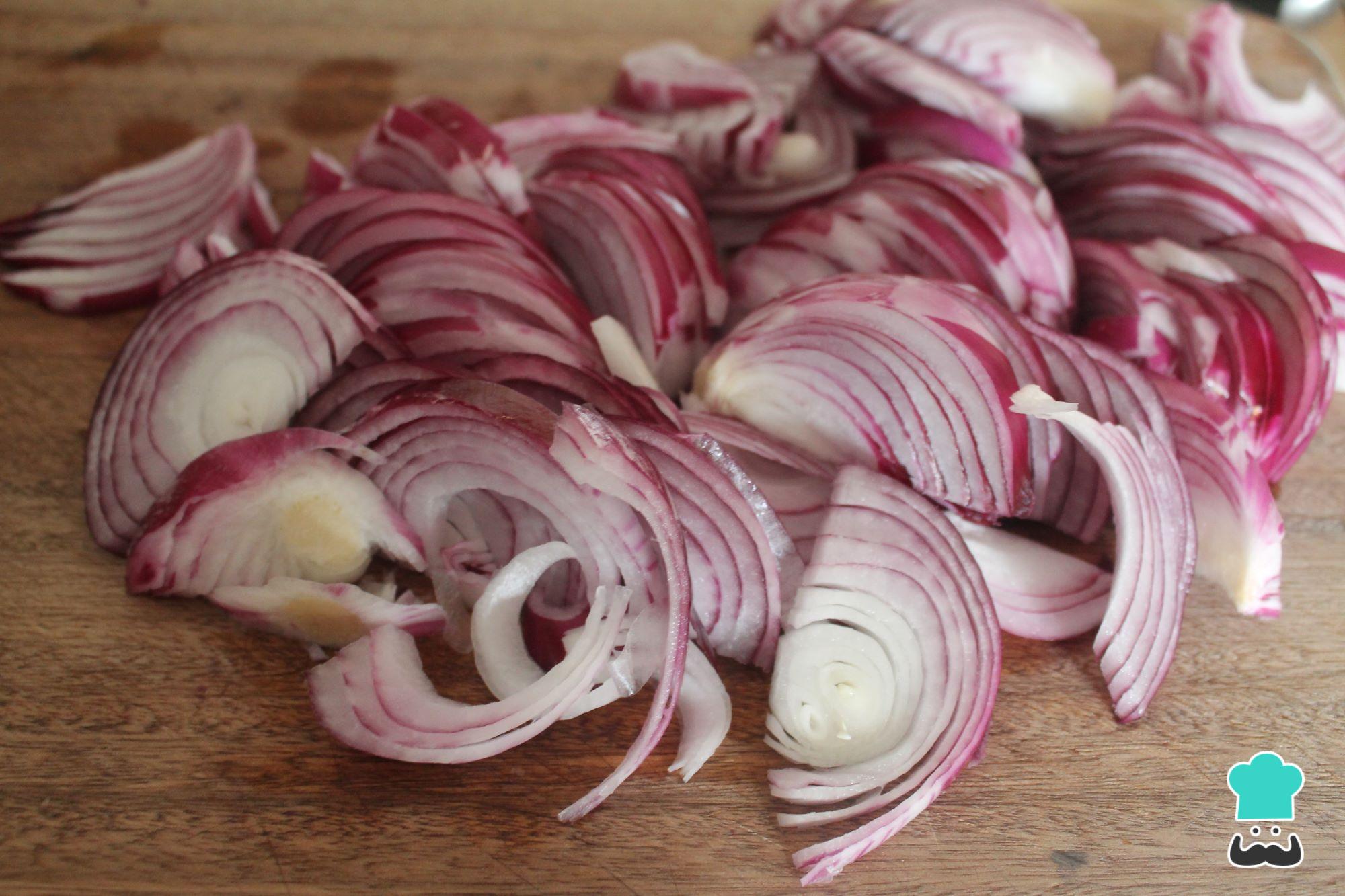 Para empezar con la receta de chutney de cebolla primero debes preparar las cebollas, para ello, debes pelarlas, córtalas por la mitad y cortar las mitades en juliana.