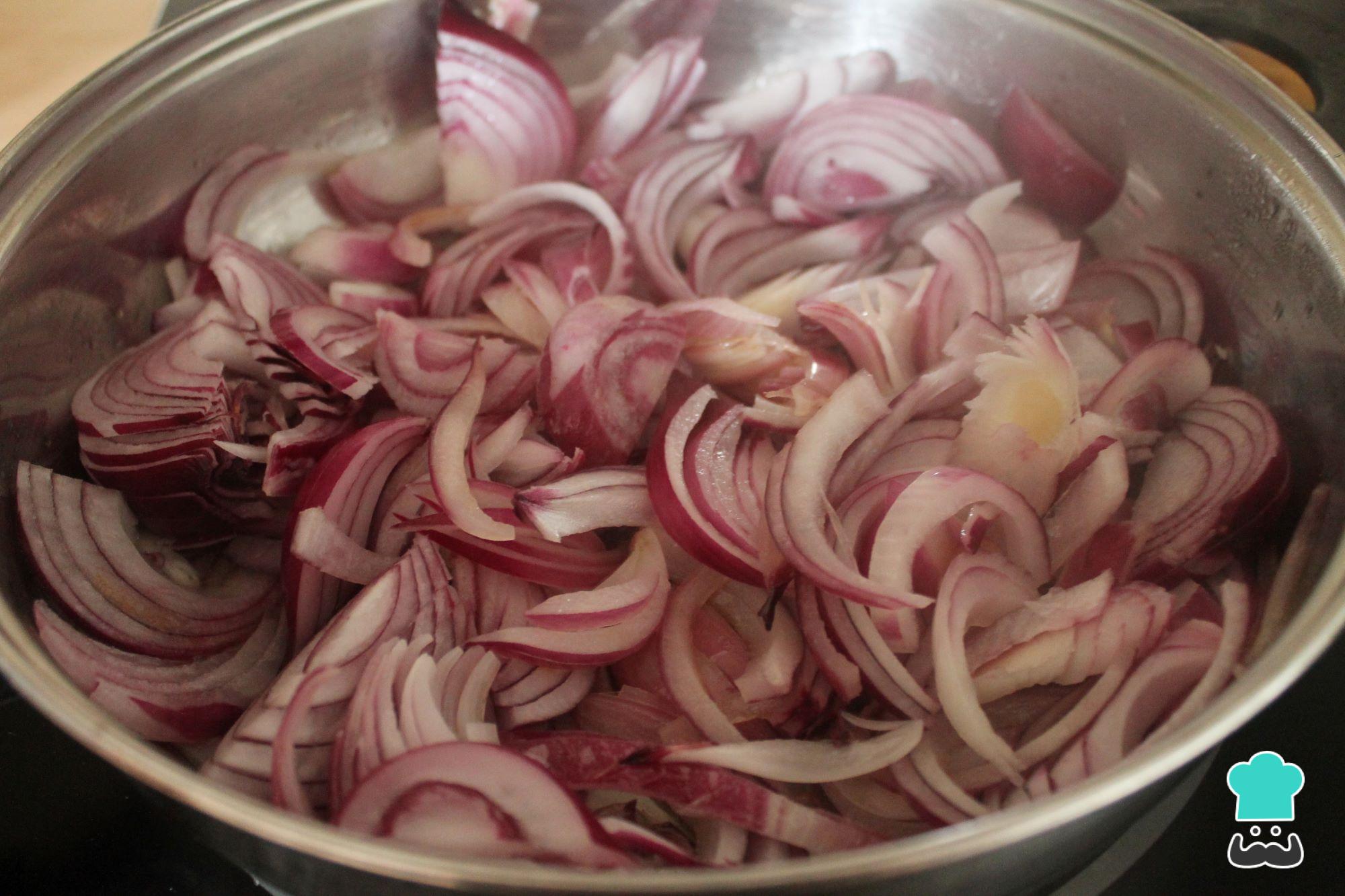 En una olla amplia añade tres cucharadas de aceite de oliva y cuando esté caliente, pon las cebollas cortadas en juliana. Rehógalas removiendo de vez en cuando durante 20 minutos a fuego suave para que se vayan confitando poco a poco.