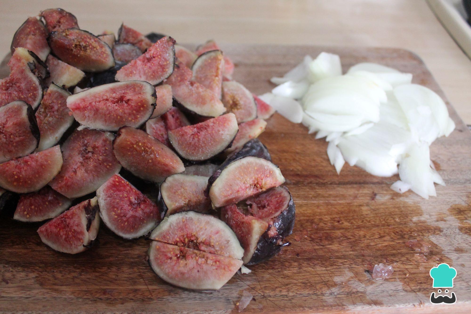 Para empezar con la receta de chutney de higos, en primer lugar lava los higos, pero no los peles, trocéalos en dos o en cuatro partes, según sea su tamaño. Pela la cebolla y córtala en juliana.
