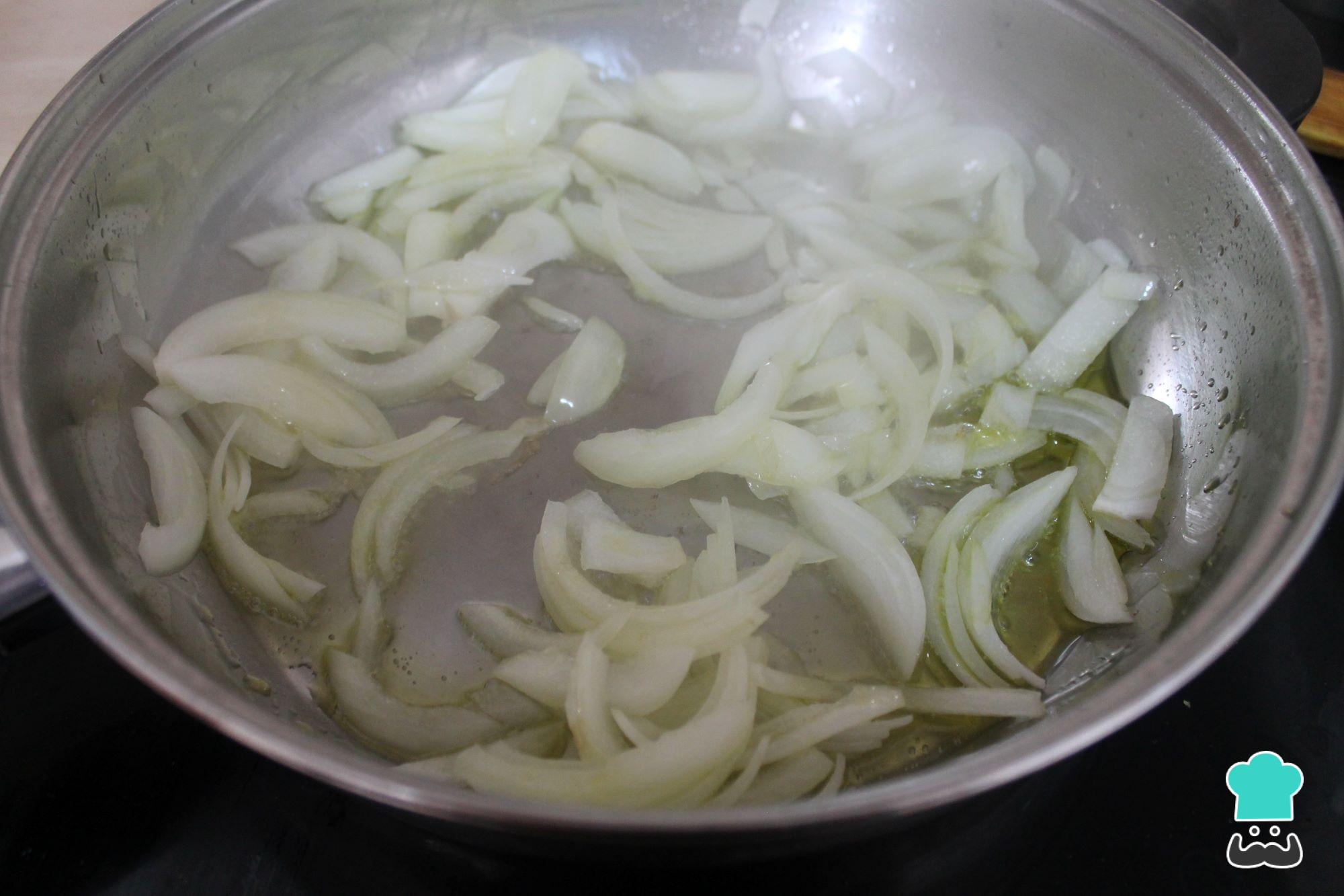 Añade al fuego una olla amplia con aceite de oliva y deja que se caliente. Vierte la cebolla y sofríe a fuego no muy fuerte hasta que tome un ligero color dorado.