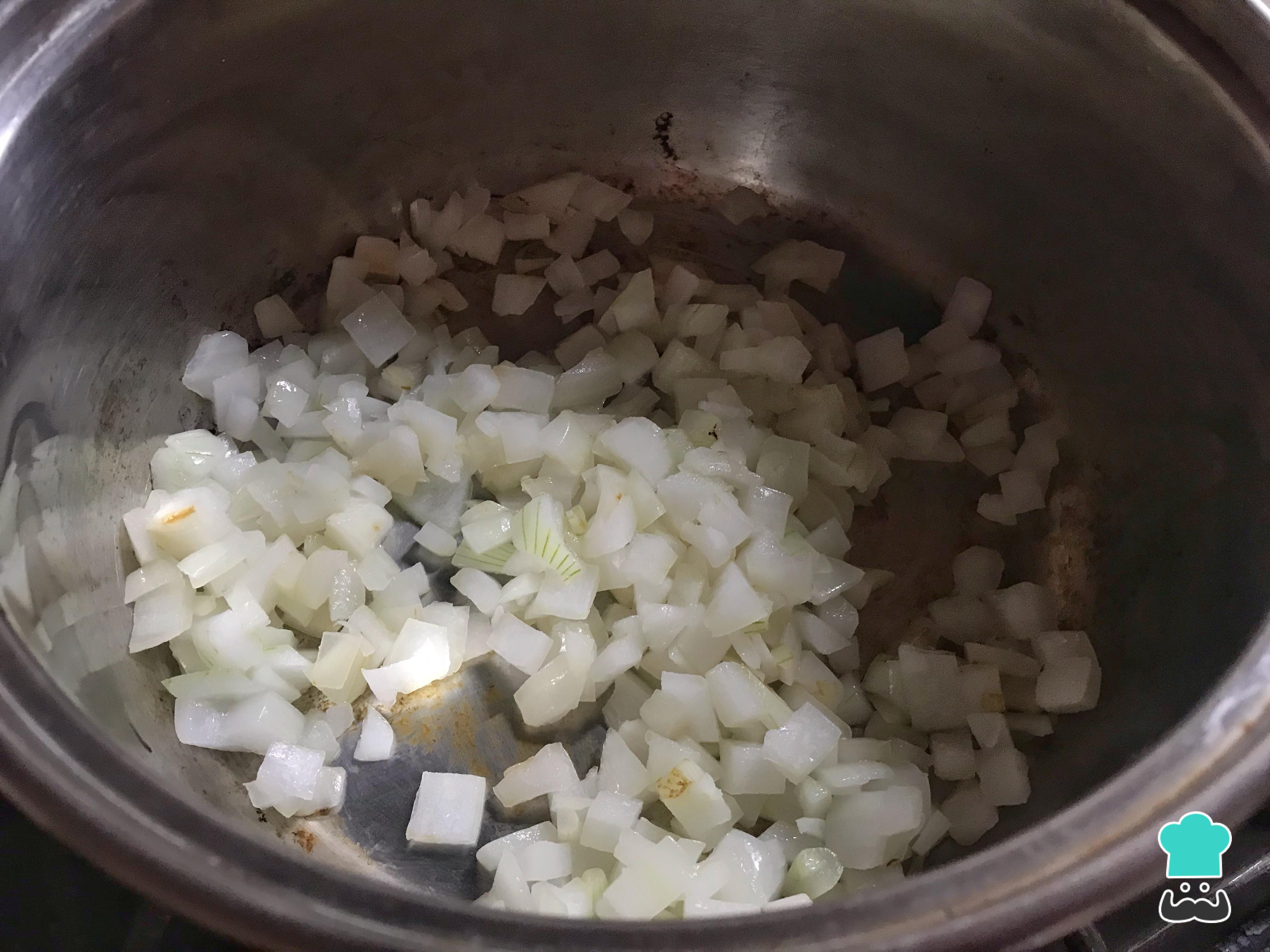 Si te preguntas cómo preparar chutney de pera, esta receta es perfecta para ti. Para empezar pela y pica la cebolla en cubitos pequeños. Calienta una olla con 1 cucharadita de aceite y agrega en ella la cebolla picada.
