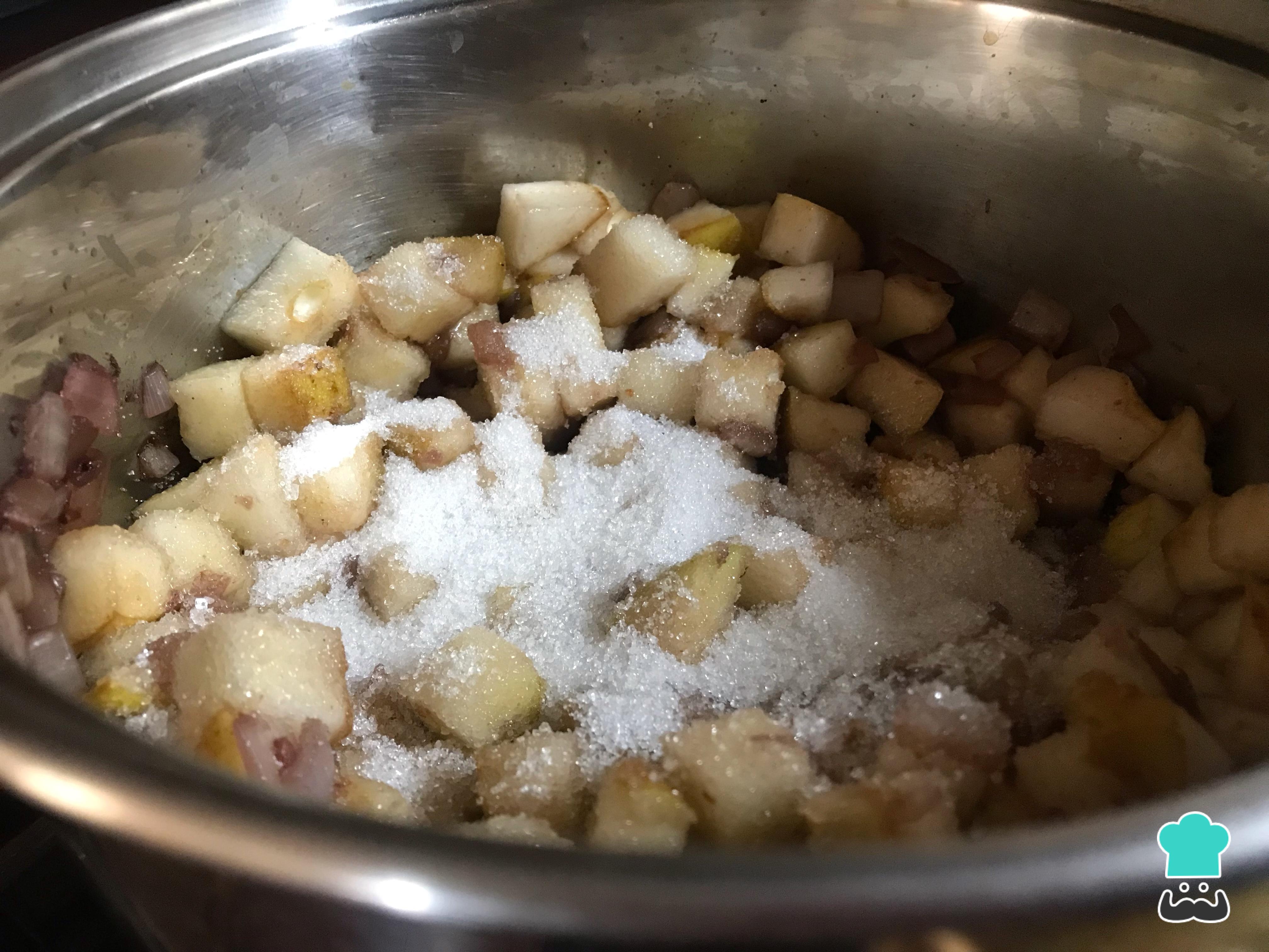 En cuanto dejes de sentir el olor ácido del alcohol, baja el fuego al mínimo y agrega la pera lavada y cortada en cubos pequeños, añade también el azúcar, el vinagre, el condimento y el azúcar. En nuestro caso también hemos añadido garam masala, una combinación de cilantro, comino, canela, clavo de olor, nuez moscada, cardamomo y pimienta negra. En cuanto al azúcar, puedes utilizar blanco o bien mascabado. En cuanto al azúcar mascabado, estará menos refinado y aportará algo de vitaminas y minerales. Sin embargo, aportará las mismas calorías y el mismo índice glucémico, por lo que no está recomendado para personas con diabetes o resistencia a la insulina.
