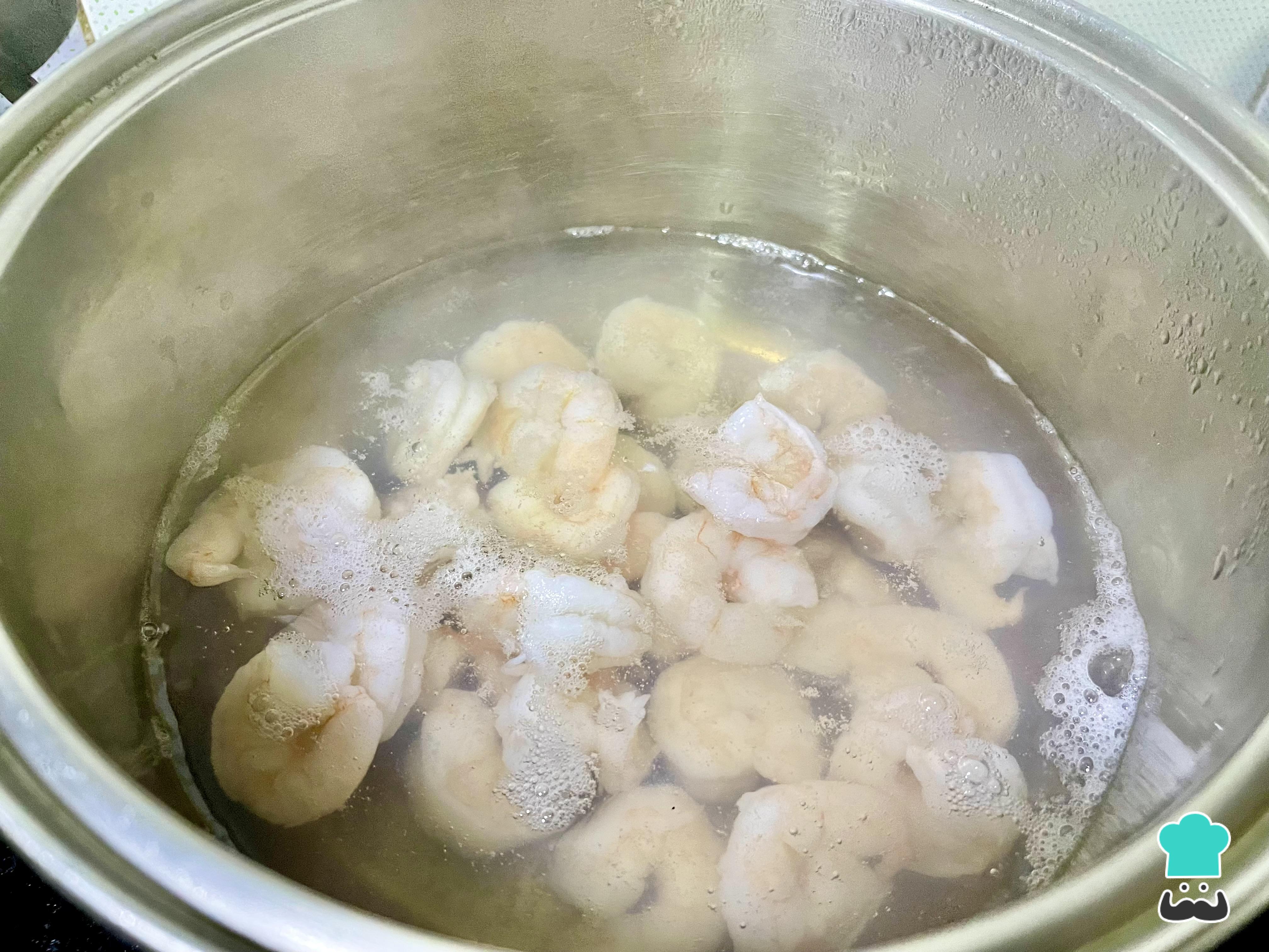 Coloca las gambas peladas en una olla con suficiente agua y añade una cucharada de sal. Cocínalas durante 3 minutos, o hasta que las gambas estén bien cocidas.