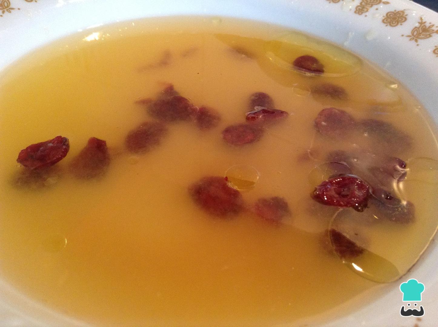 En un tazón o plato hondo agrega el zumo de naranja, la miel de abejas, el aceite de oliva, sal, pimienta negra y canela. Mezcla bien los ingredientes para que se integren y añade los arándanos.