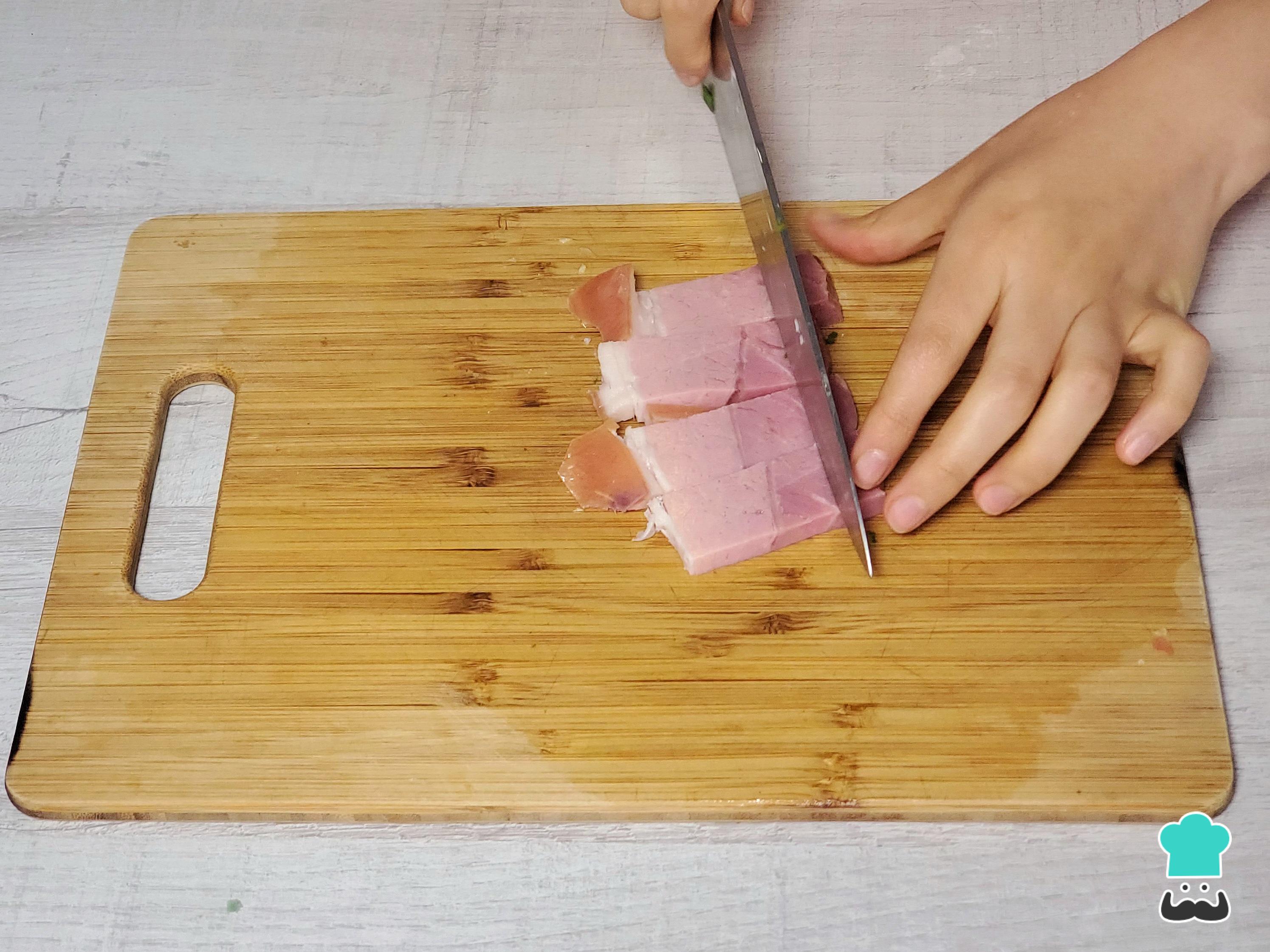 Corta el bacon o tocino en lardones, es decir, en tiras verticales que conserven las tres capas de grasa y carne.