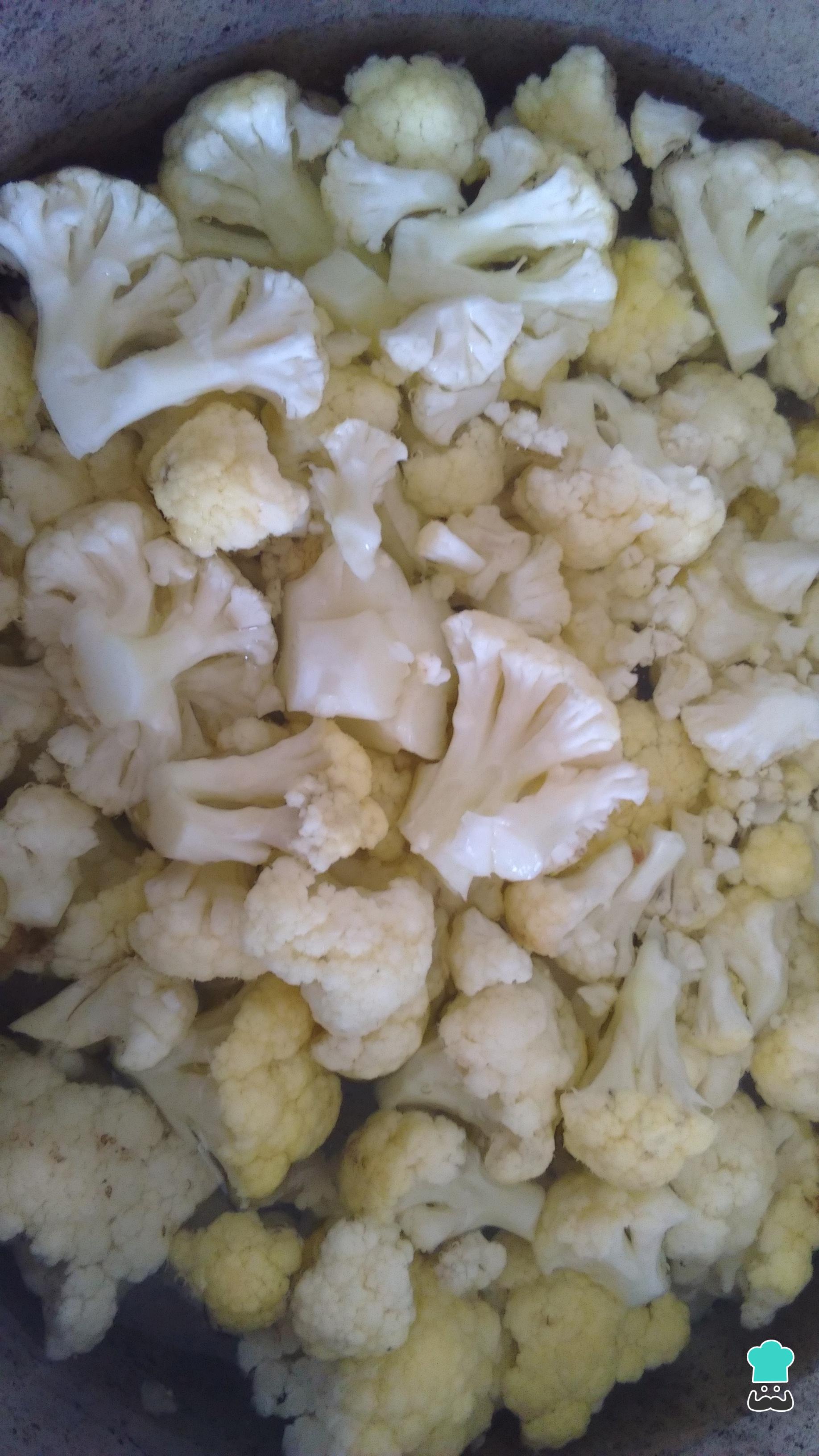 Para comenzar con este saltadito de coliflor con pollo o carne, calienta agua en una olla y, cuando hierva, agrega la coliflor picada en florecitas medianas. Déjala cocinar a fuego bajo por un tiempo de 15 minutos, aproximadamente.
