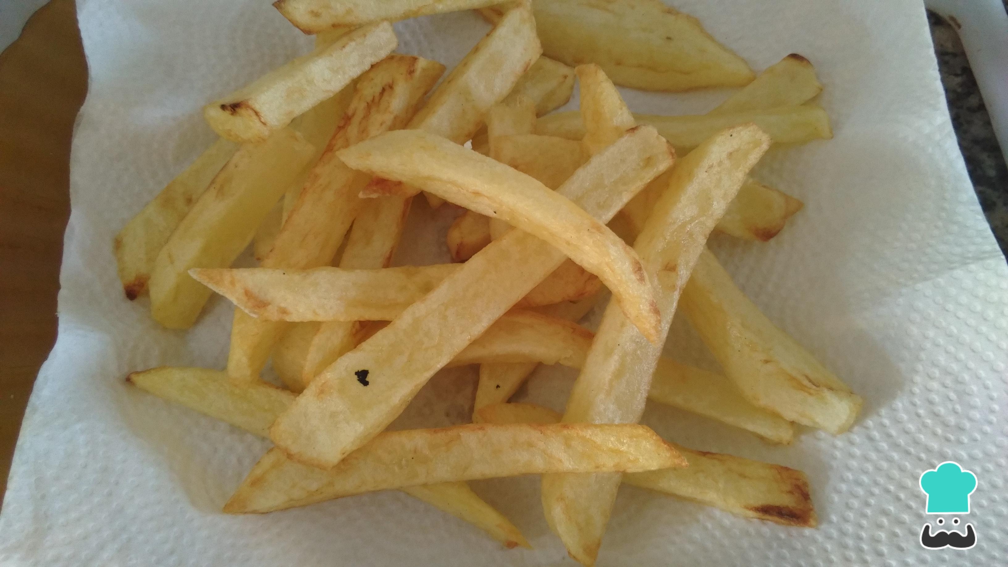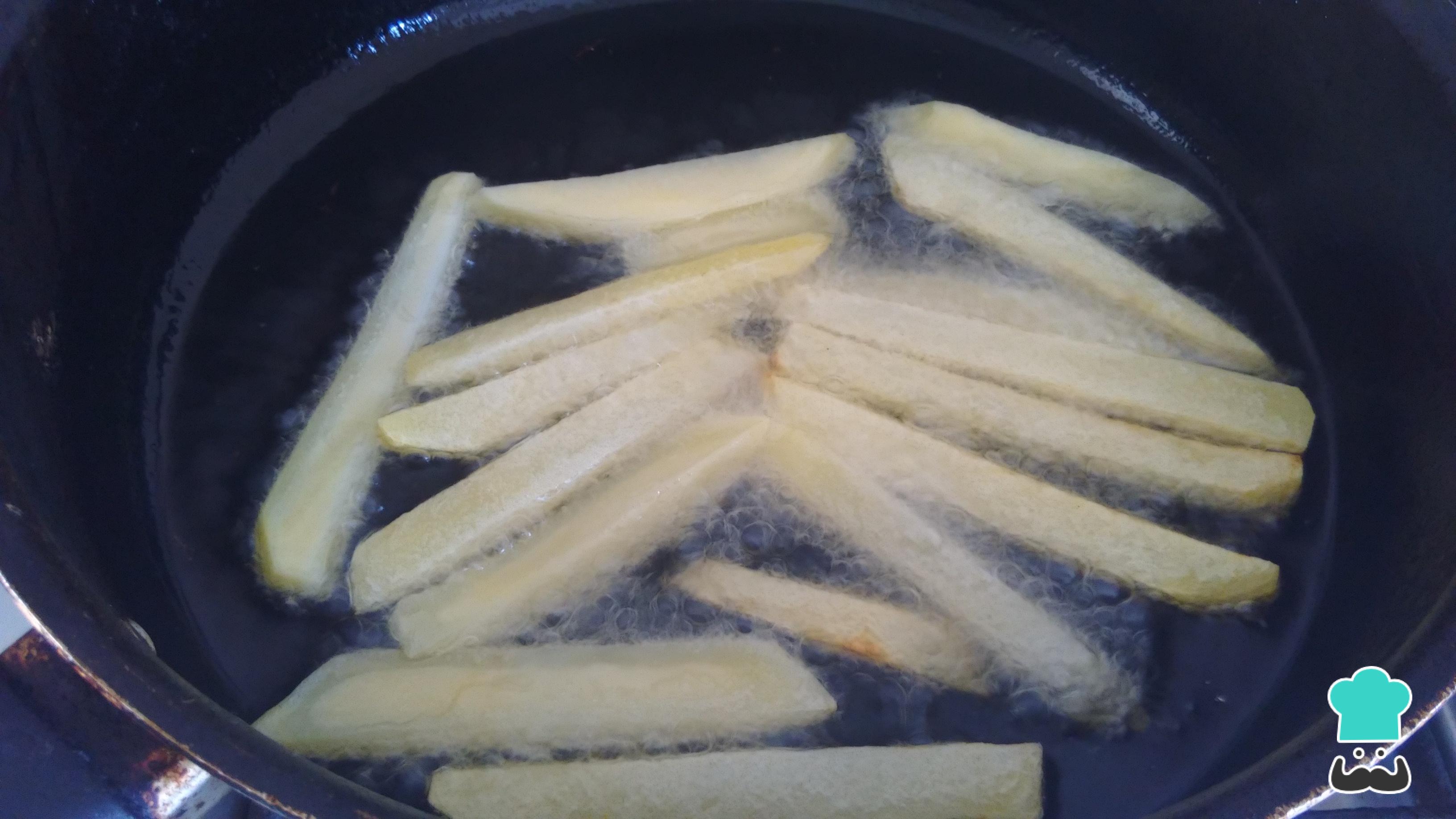 Mientras, pela y pica las papas a la francesa y fríelas en abundante aceite. Para que las papas te queden con una mejor consistencia, sumérgelas en agua fría con algo de sal por, al menos, 1 hora. Eso sí, recuerda secarlas bien con una servilleta antes de freírlas.