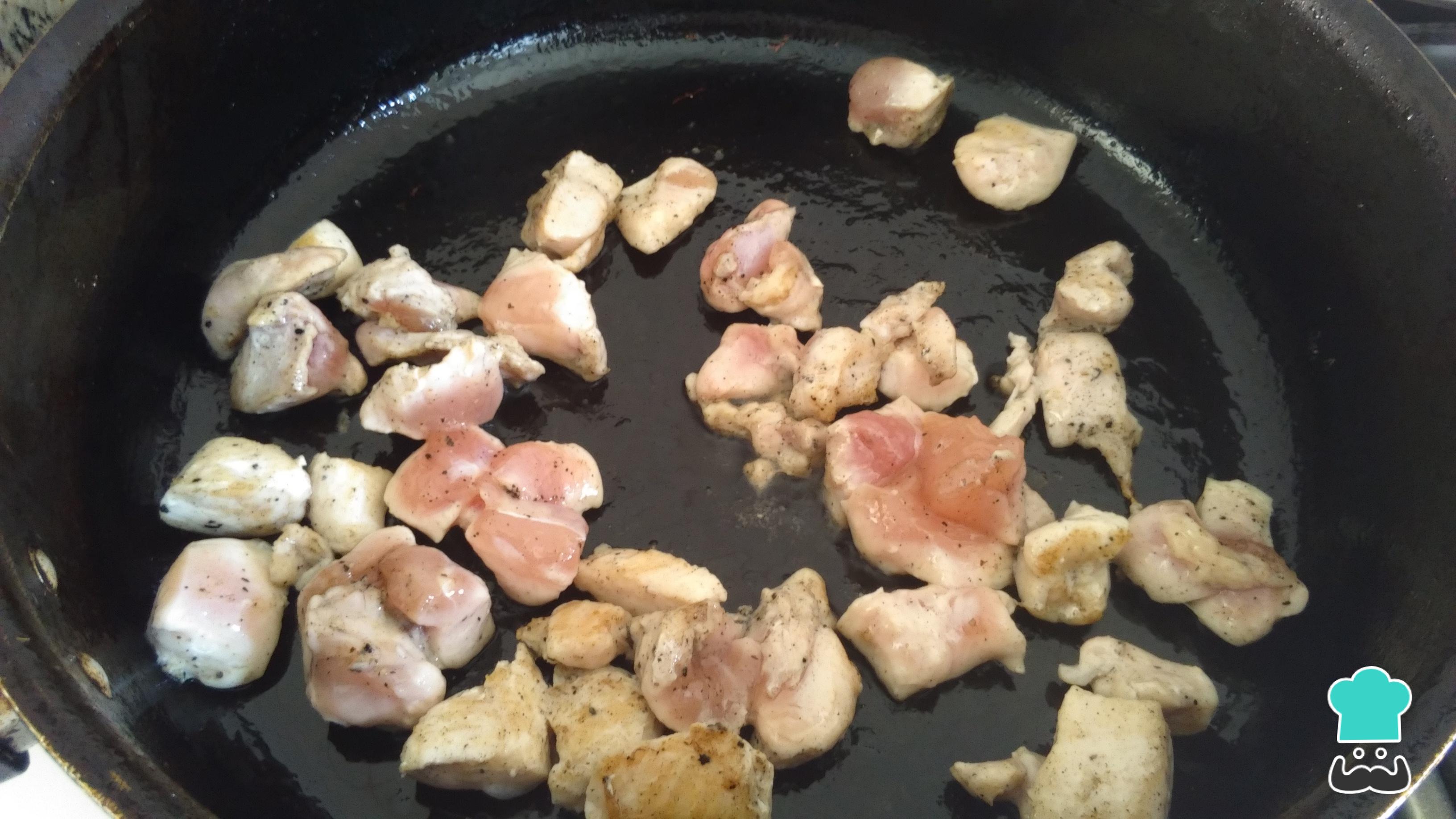 Ahora, sofríe el pollo o carne picado en pedazos y previamente condimentado con sal, ajo, pimienta y comino.