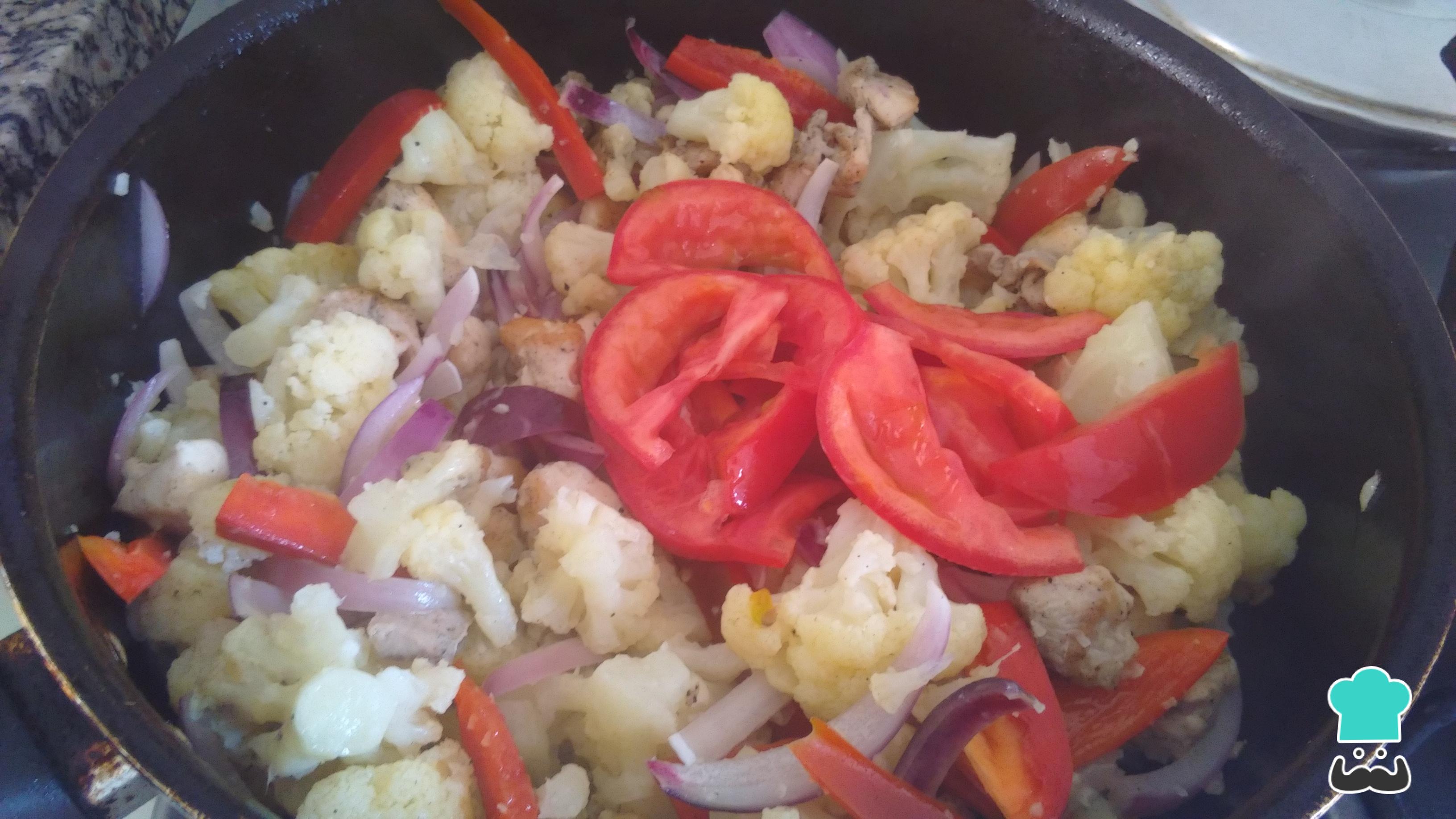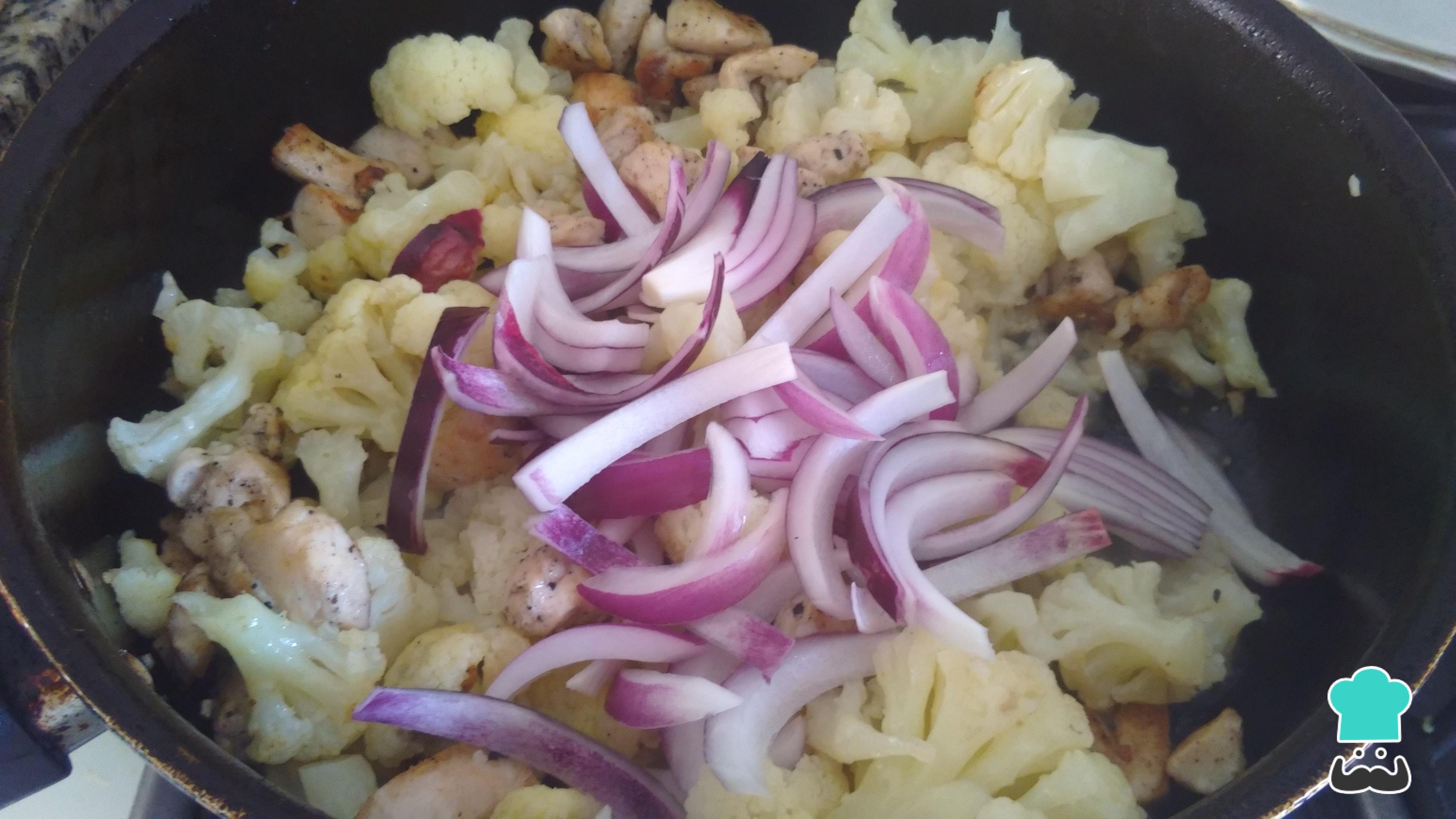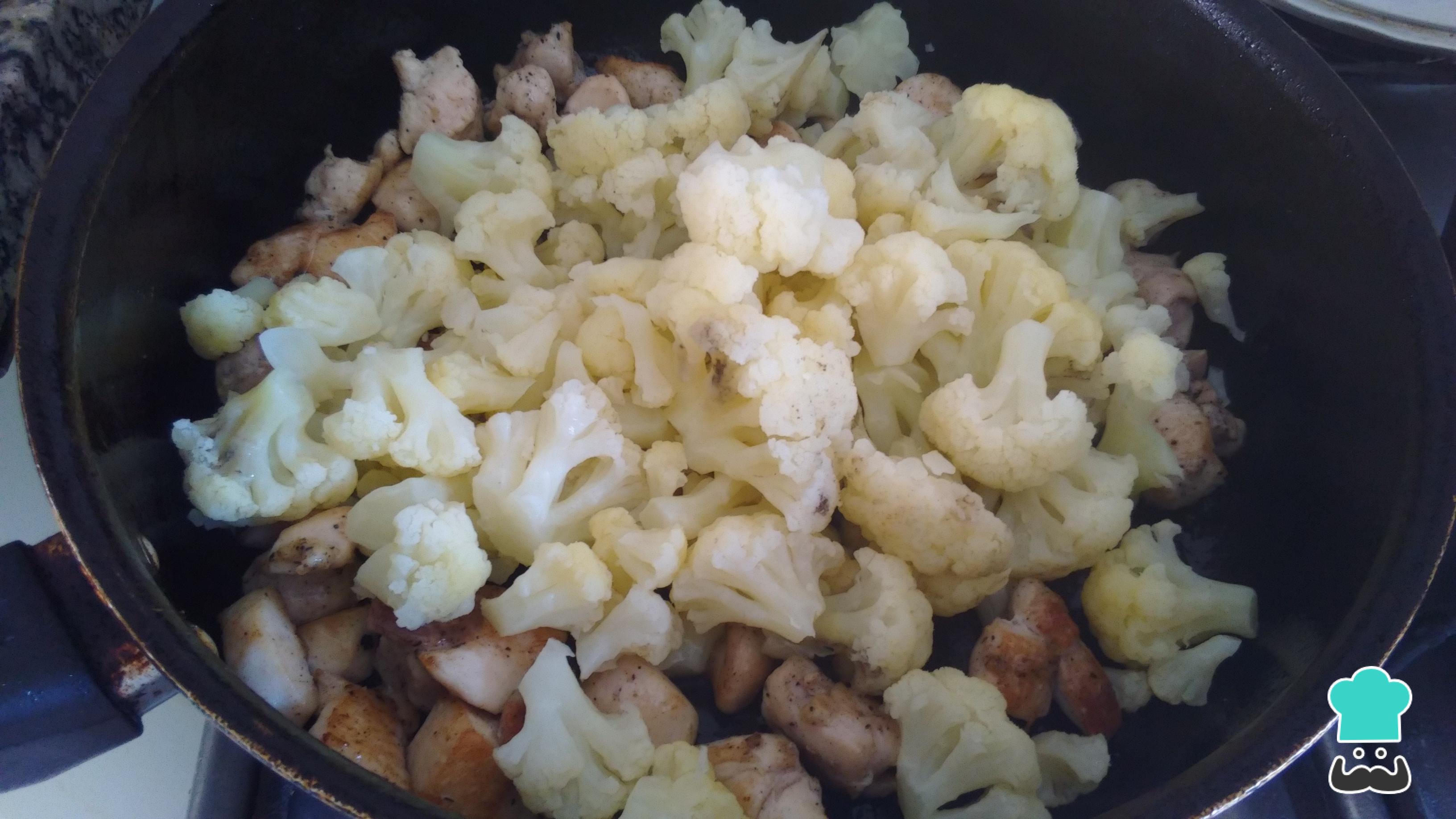 Cuando el pollo esté bien dorado, añade la coliflor. Mezcla bien para que se impregne bien el sabor del pollo. Cocina por un minuto.