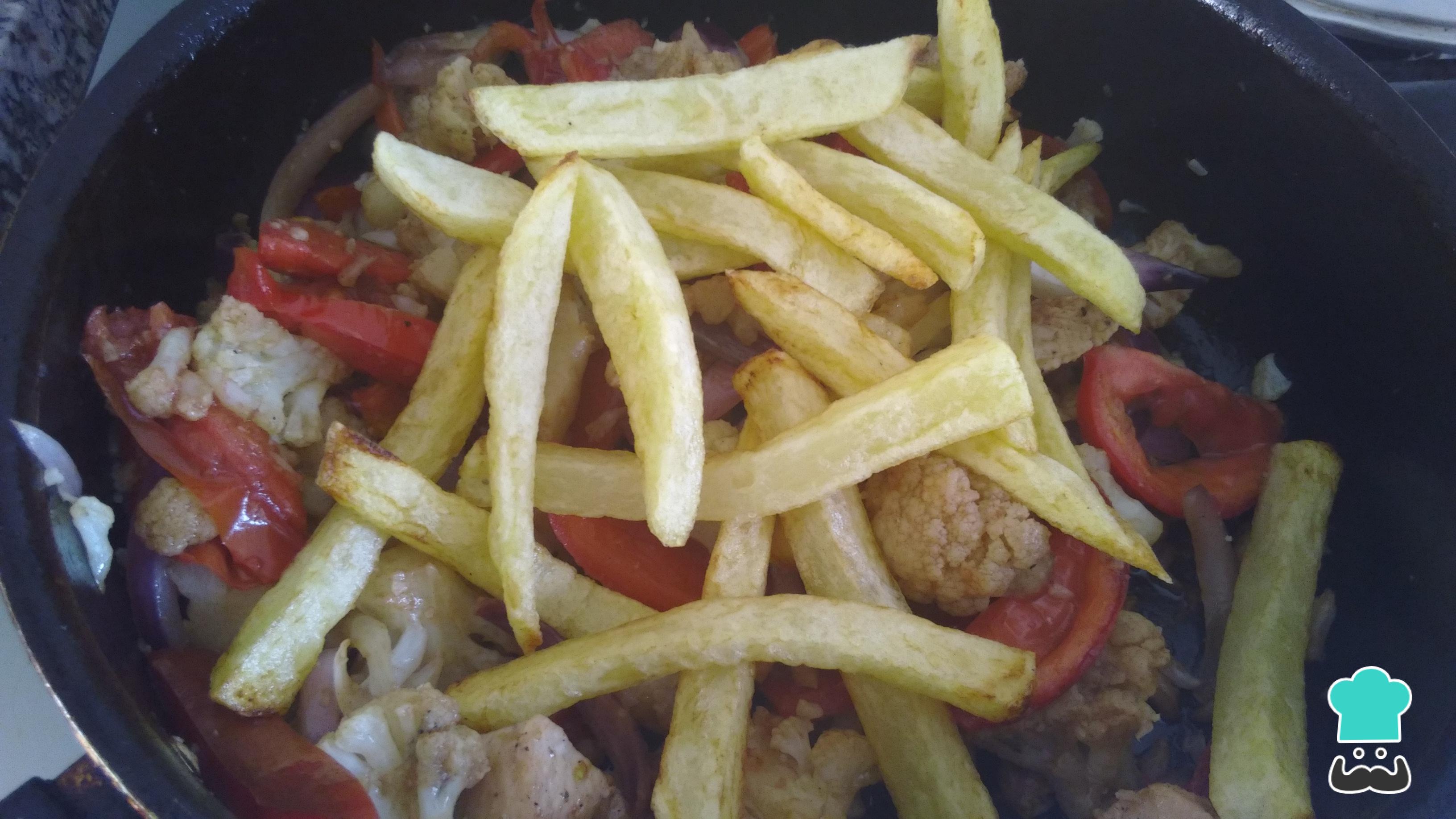 Deja cocinar por un minuto o dos. Corrige el punto sal y apaga. Por último, adiciona las papas fritas que tenías en reserva y revuelve bien, pero con cuidado para que los vegetales se conserven enteros. Sirve la coliflor saltada con sillao caliente y acompañada de arroz blanco.