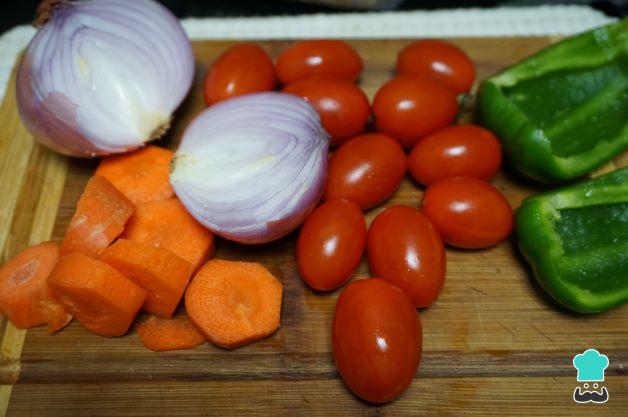 Prepara las verduras, se lavan y se pelan, las cortas en cuartos o si te gustan las dejas enteras como los tomates Cherry. También puedes poner tomates normales cortados por la mitad.