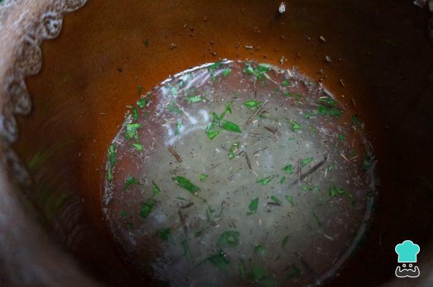 Coge un mortero, pon los dientes de ajos en trozos, las hierbas, el perejil, un poco de sal y pimienta, machaca en el mortero un poco todo junto se haga una pasta. Añade el vino blanco, remueve y mézclalo bien. Utiliza las hierbas que te gusten o que gusten más en tu casa, puedes poner orégano, albahaca, hierbas provenzales, tomillo... Al conejo le va muy bien las hierbas.