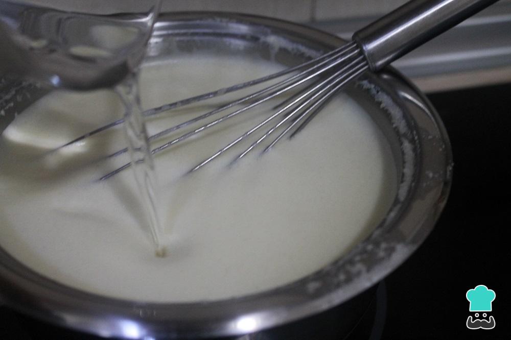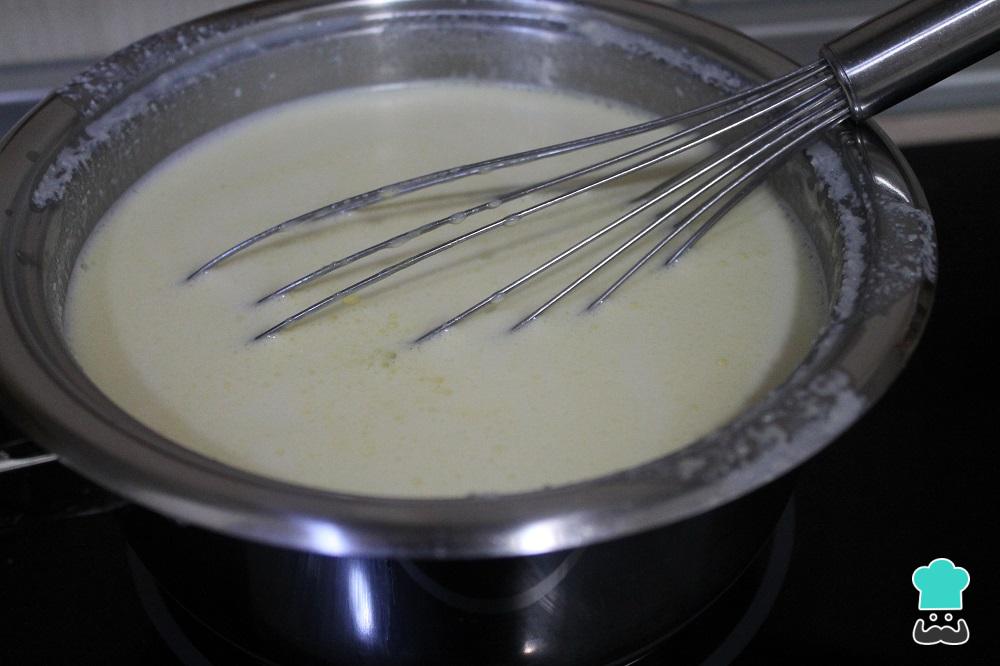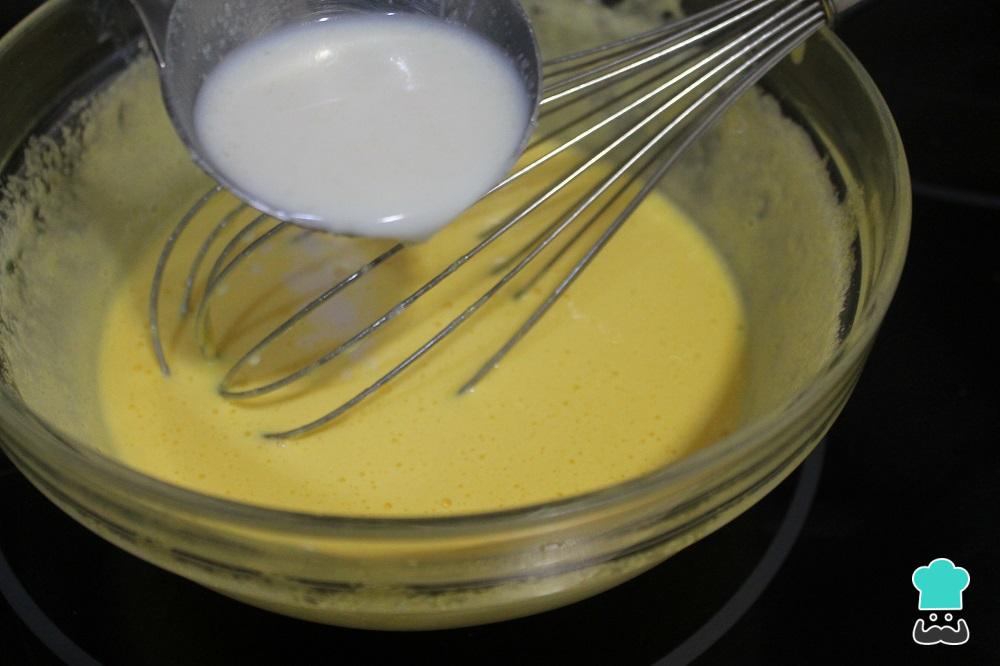 Una vez caliente la leche, vertemos un cacito de la leche en la mezcla de yemas con azúcar y maicena, y removemos seguidamente para que las yemas no se cuajen. Vertemos otro cacito más y mezclamos.