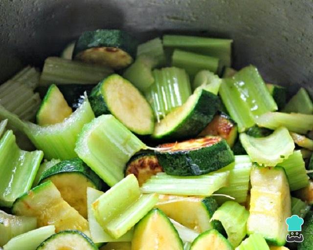 Para hacer esta deliciosa crema de apio, el primer paso es cortar el calabacín y el apio en trozos más o menos pequeños.