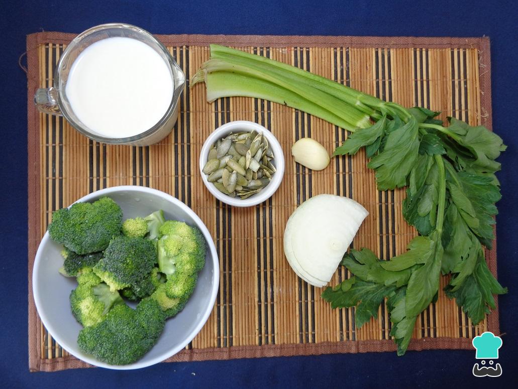 En la siguiente imagen podrás observar los ingredientes que necesitaremos para la preparación de esta deliciosa crema de brócoli vegana, no te pierdas ningún detalle.