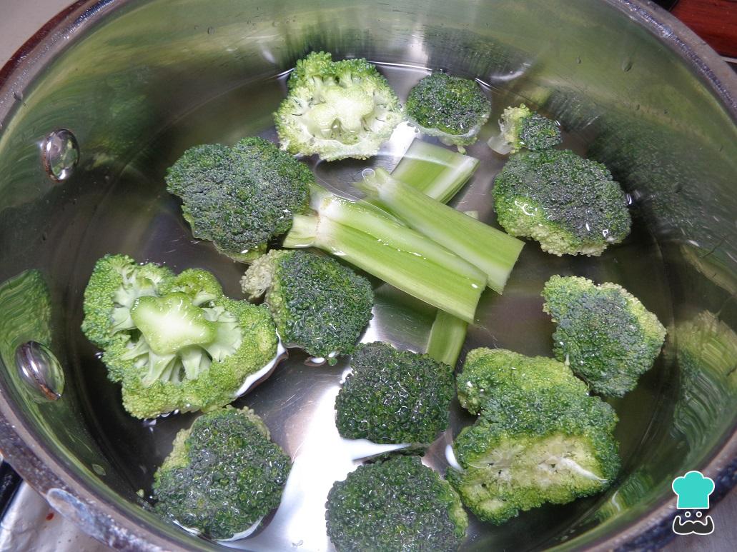 Empezamos entonces por cocinar el brócoli, para ello, lo cortamos en trozos pequeños, lo lavamos perfectamente y lo colocamos una cacerola con suficiente agua hirviendo y una pizca de sal.